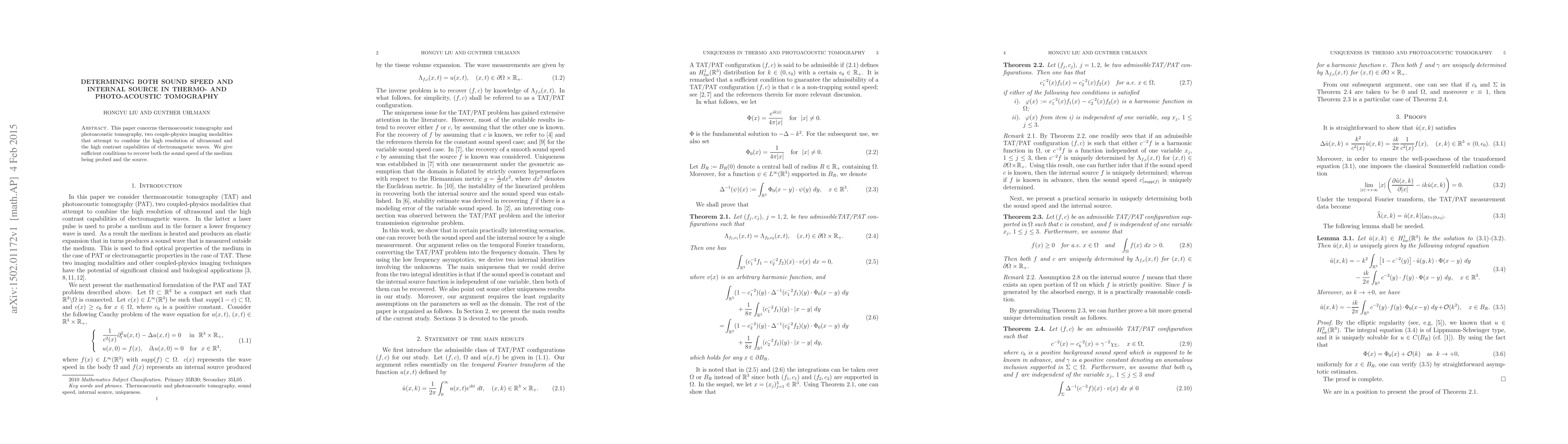 This paper concerns thermoacoustic tomography and photoacoustic tomography, two couple-physics imaging modalities that attempt to combine the high resolution of ultrasound and the high contrast capabilities of electromagnetic waves. We give sufficient conditions to recover both the sound speed of the medium being probed and the source.