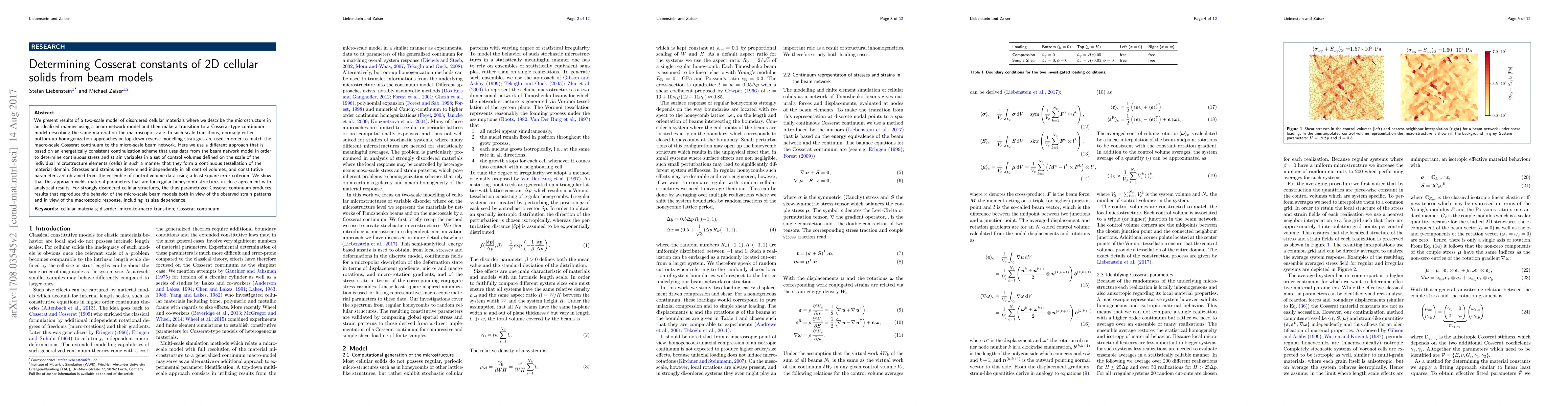 We present results of a two-scale model of disordered cellular materials where we describe the microstructure in an idealized manner using a beam network model and then make a transition to a Cosserat-type continuum model describing the same material on the macroscopic scale. In such scale transitions, normally either bottom-up homogenization approaches or top-down reverse modelling strategies are used in order to match the macro-scale Cosserat continuum to the micro-scale beam network. Here we use a different approach that is based on an energetically consistent continuization scheme that uses data from the beam network model in order to determine continuous stress and strain variables in a set of control volumes defined on the scale of the individual microstructure elements (cells) in such a manner that they form a continuous tessellation of the material domain. Stresses and strains are determined independently in all control volumes, and constitutive parameters are obtained from the ensemble of control volume data using a least-square error criterion. We show that this approach yields material parameters that are for regular honeycomb structures in close agreement with analytical results. For strongly disordered cellular structures, the thus parametrized Cosserat continuum produces results that reproduce the behavior of the micro-scale beam models both in view of the observed strain patterns and in view of the macroscopic response, including its size dependence.
