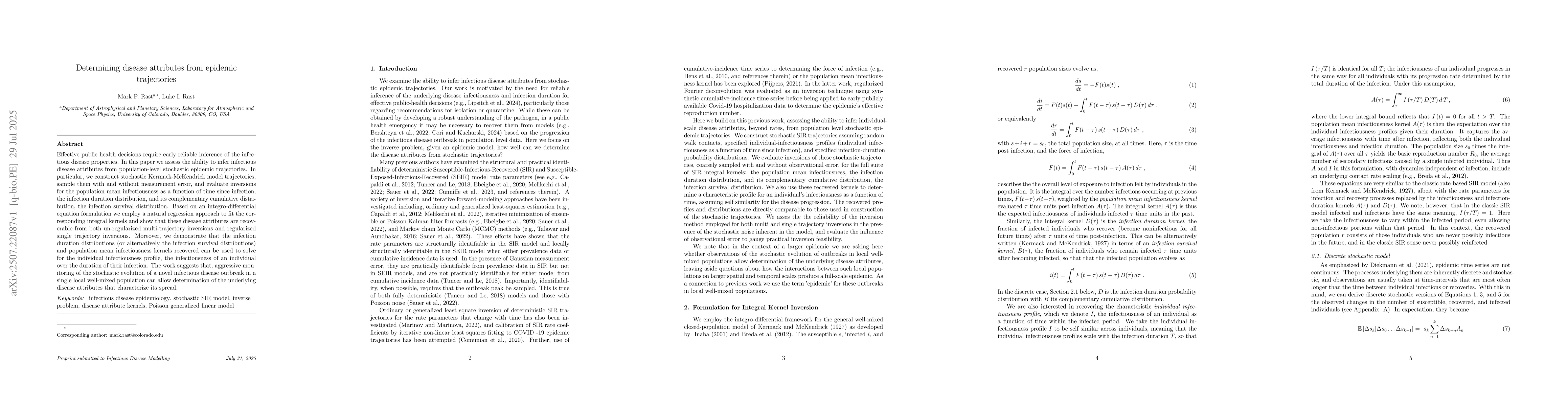 Effective public health decisions require early reliable inference of the infectious disease properties. In this paper we assess the ability to infer infectious disease attributes from population-level stochastic epidemic trajectories. In particular, we construct stochastic Kermack-McKendrick model trajectories, sample them with and without measurement error, and evaluate inversions for the population mean infectiousness as a function of time since infection, the infection duration distribution, and its complementary cumulative distribution, the infection survival distribution. Based on an integro-differential equation formulation we employ a natural regression approach to fit the corresponding integral kernels and show that these disease attributes are recoverable from both un-regularized multi-trajectory inversions and regularized single trajectory inversions. Moreover, we demonstrate that the infection duration distributions (or alternatively the infection survival distributions) and population mean infectiousness kernels recovered can be used to solve for the individual infectiousness profile, the infectiousness of an individual over the duration of their infection. The work suggests that, aggressive monitoring of the stochastic evolution of a novel infectious disease outbreak in a single local well-mixed population can allow determination of the underlying disease attributes that characterize its spread.