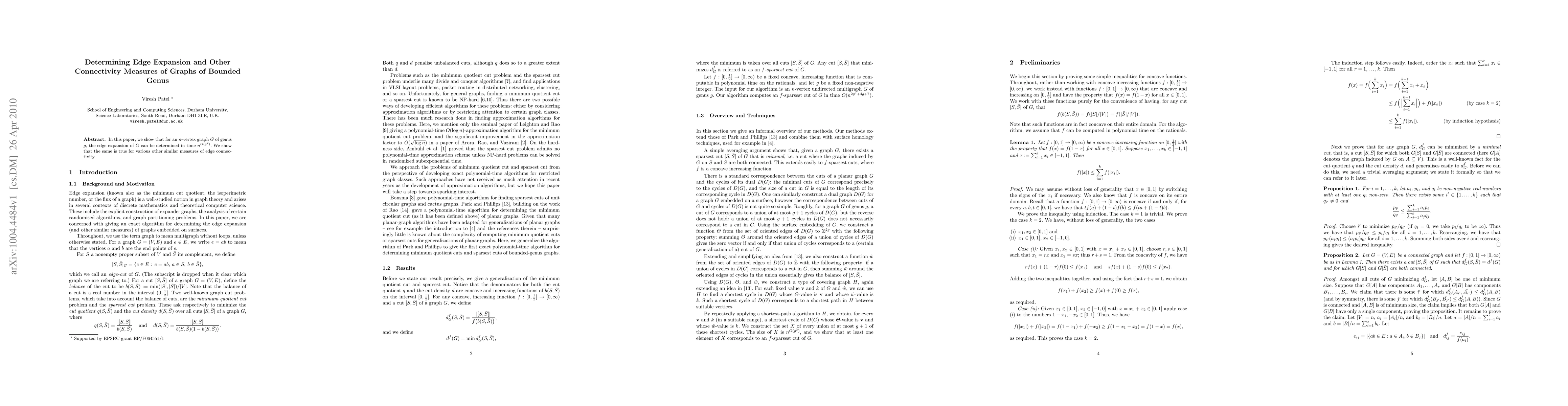 In this paper, we show that for an $n$-vertex graph $G$ of genus $g$, the edge expansion of $G$ can be determined in time $n^{O(g^2)}$. We show that the same is true for various other similar measures of edge connectivity.