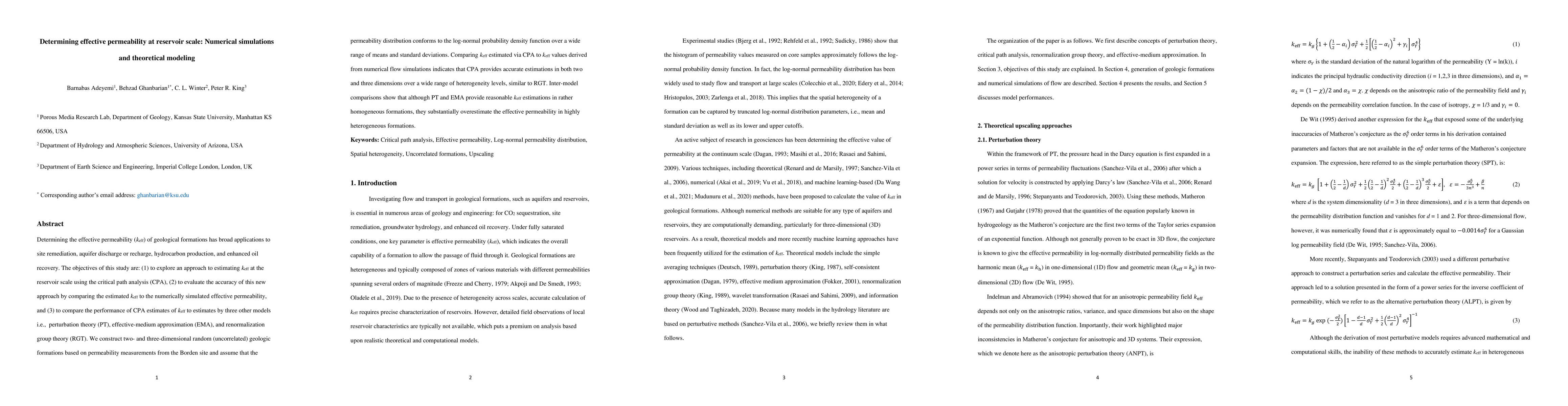 Determining the effective permeability (keff) of geological formations has broad applications to site remediation, aquifer discharge or recharge, hydrocarbon production, and enhanced oil recovery. The objectives of this study are: (1) to explore an approach to estimating keff at the reservoir scale using the critical path analysis (CPA), (2) to evaluate the accuracy of this new approach by comparing the estimated keff to the numerically simulated effective permeability, and (3) to compare the performance of CPA estimates of keff to estimates by three other models i.e., perturbation theory (PT), effective-medium approximation (EMA), and renormalization group theory (RGT). We construct two- and three-dimensional random (uncorrelated) geologic formations based on permeability measurements from the Borden site and assume that the permeability distribution conforms to the log-normal probability density function over a wide range of means and standard deviations. Comparing keff estimated via CPA to keff values derived from numerical flow simulations indicates that CPA provides accurate estimations in both two and three dimensions over a wide range of heterogeneity levels, similar to RGT. Inter-model comparisons show that although PT and EMA provide reasonable keff estimations in rather homogeneous formations, they substantially overestimate the effective permeability in highly heterogeneous formations.