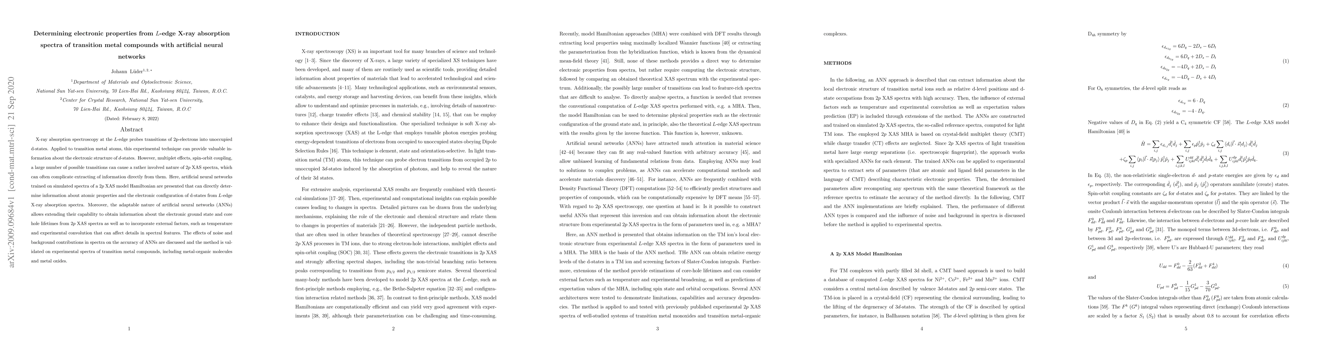This paper explores the use of artificial neural networks (ANNs) to determine electronic properties from L-edge X-ray absorption spectra of transition metal compounds, addressing the complexity of 2p XAS spectra through trained models. The method is validated on experimental data, demonstrating its capability to extract atomic and electronic configuration information, even with noise and background contributions.