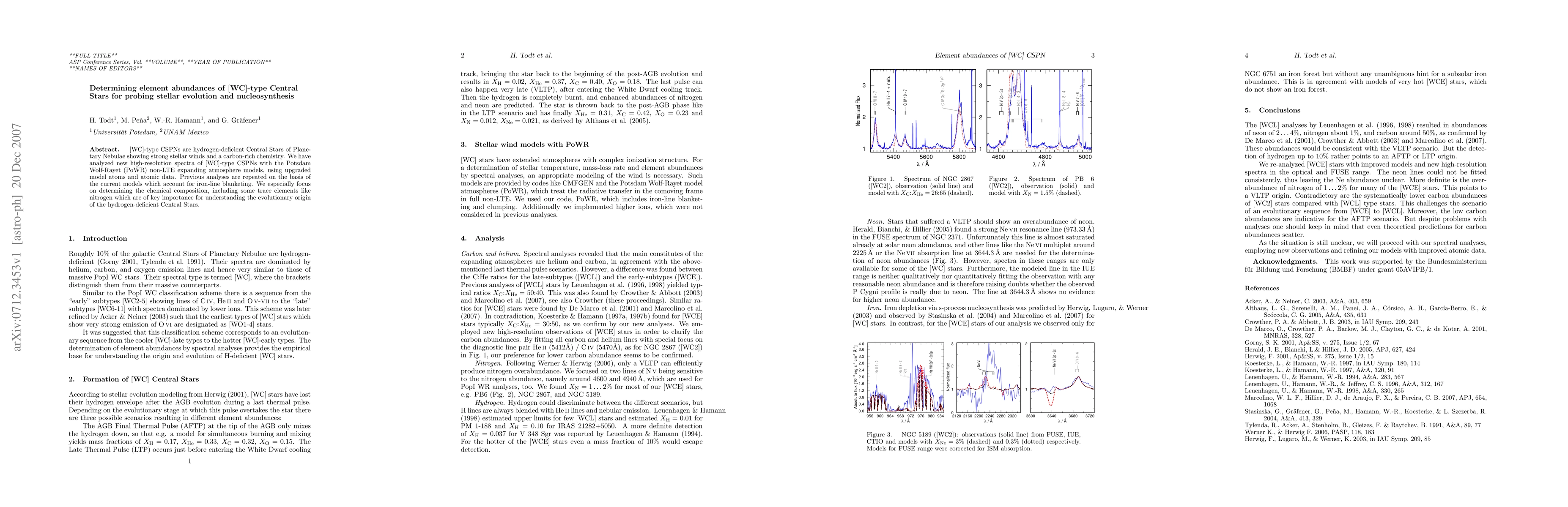 [WC]-type CSPNs are hydrogen-deficient Central Stars of Planetary Nebulae showing strong stellar winds and a carbon-rich chemistry. We have analyzed new high-resolution spectra of [WC]-type CSPNs with the Potsdam Wolf-Rayet (PoWR) non-LTE expanding atmosphere models, using upgraded model atoms and atomic data. Previous analyses are repeated on the basis of the current models which account for iron-line blanketing. We especially focus on determining the chemical composition, including some trace elements like nitrogen which are of key importance for understanding the evolutionary origin of the hydrogen-deficient Central Stars.