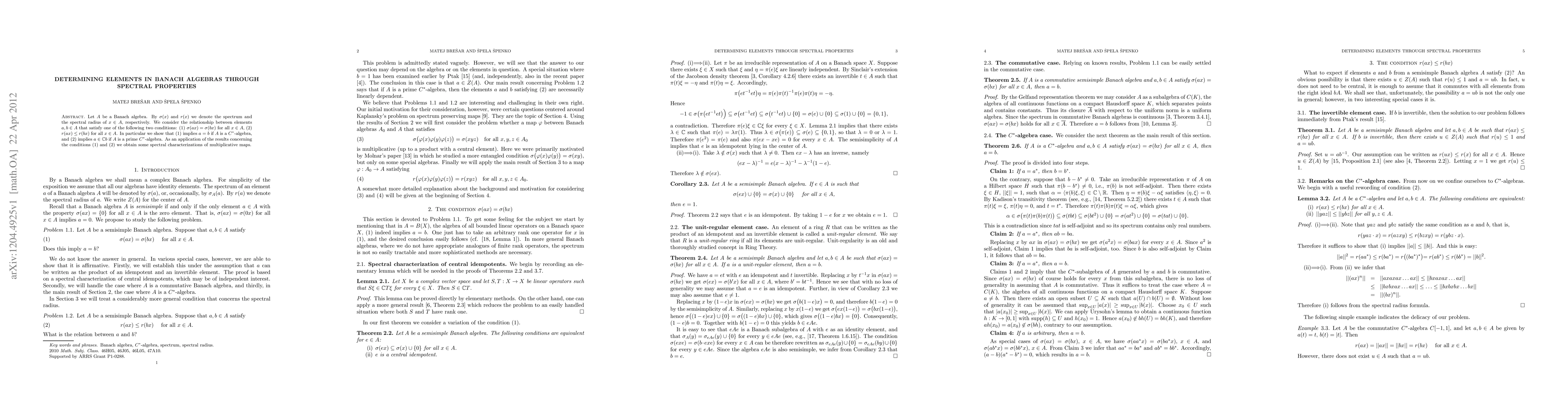 Let $A$ be a Banach algebra. By $\sigma(x)$ and $r(x)$ we denote the spectrum and the spectral radius of $x\in A$, respectively. We consider the relationship between elements $a,b\in A$ that satisfy one of the following two conditions: (1) $\sigma(ax) = \sigma(bx)$ for all $x\in A$, (2) $r(ax) \le r(bx)$ for all $x\in A$. In particular we show that (1) implies $a=b$ if $A$ is a $C^*$-algebra, and (2) implies $a\in \mathbb C b$ if $A$ is a prime $C^*$-algebra. As an application of the results concerning the conditions (1) and (2) we obtain some spectral characterizations of multiplicative maps.