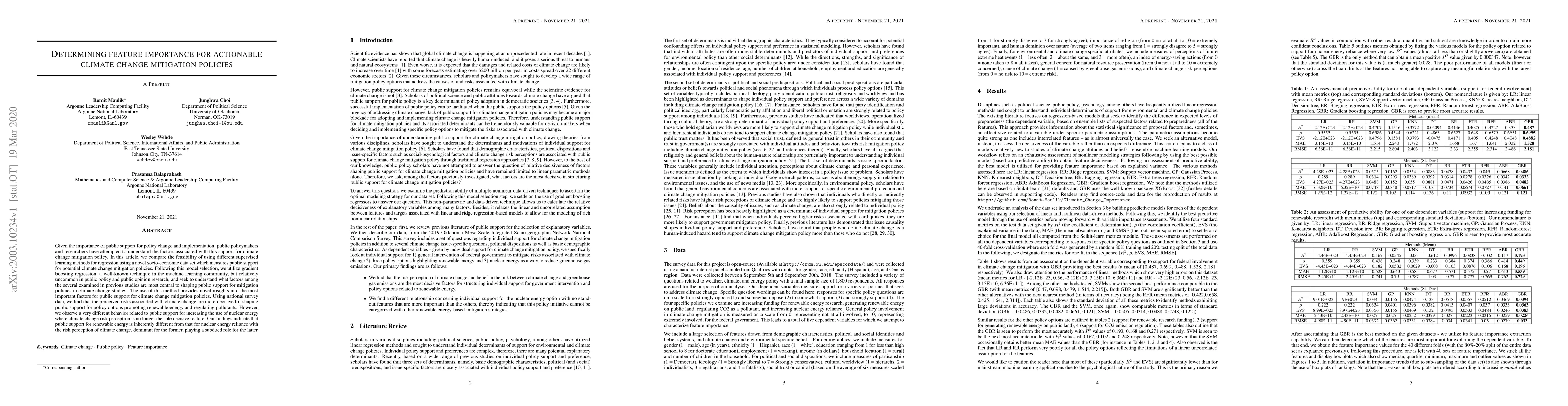 This paper evaluates various supervised learning methods to determine the most influential factors shaping public support for climate change mitigation policies using a socio-economic dataset. It finds that perceived climate change risks are crucial for supporting renewable energy policies but less so for nuclear energy, highlighting differing public attitudes towards these two energy sources.