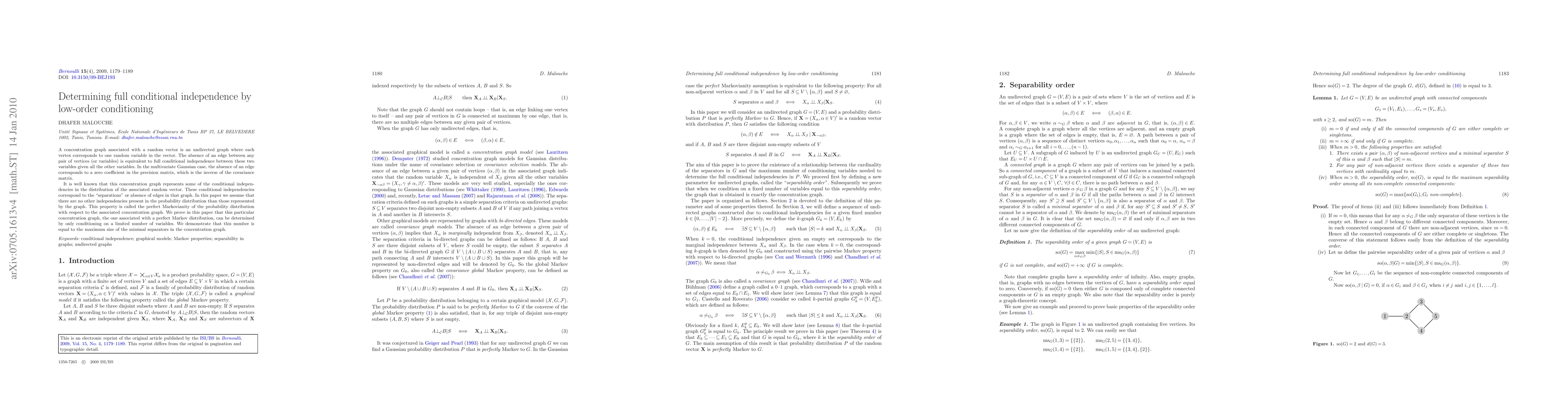A concentration graph associated with a random vector is an undirected graph where each vertex corresponds to one random variable in the vector. The absence of an edge between any pair of vertices (or variables) is equivalent to full conditional independence between these two variables given all the other variables. In the multivariate Gaussian case, the absence of an edge corresponds to a zero coefficient in the precision matrix, which is the inverse of the covariance matrix. It is well known that this concentration graph represents some of the conditional independencies in the distribution of the associated random vector. These conditional independencies correspond to the "separations" or absence of edges in that graph. In this paper we assume that there are no other independencies present in the probability distribution than those represented by the graph. This property is called the perfect Markovianity of the probability distribution with respect to the associated concentration graph. We prove in this paper that this particular concentration graph, the one associated with a perfect Markov distribution, can be determined by only conditioning on a limited number of variables. We demonstrate that this number is equal to the maximum size of the minimal separators in the concentration graph.