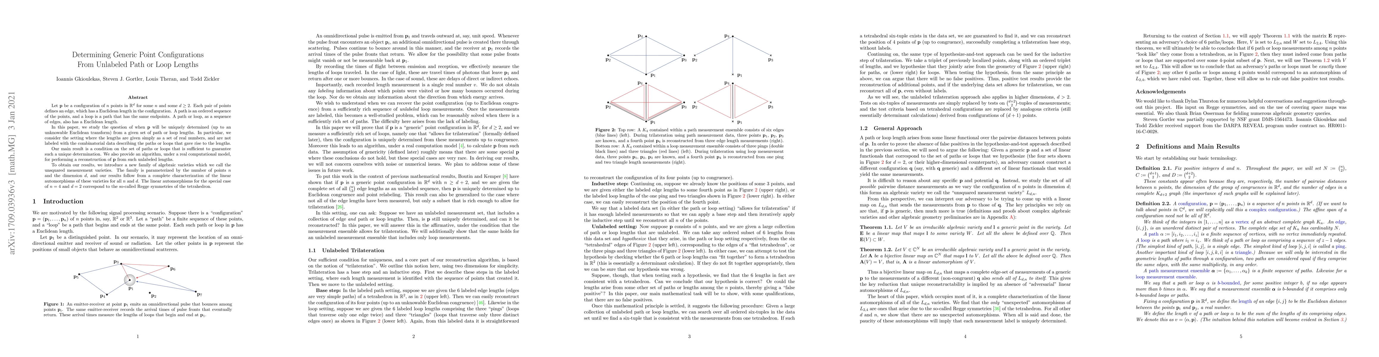 This paper presents a method to determine unique point configurations in u211d^d from unlabeled path or loop lengths, introducing unsquared measurement varieties. It provides a condition for unique determination and an algorithm for reconstruction, characterizing linear automorphisms for all n and d, with special case insights into Regge symmetries of the tetrahedron.