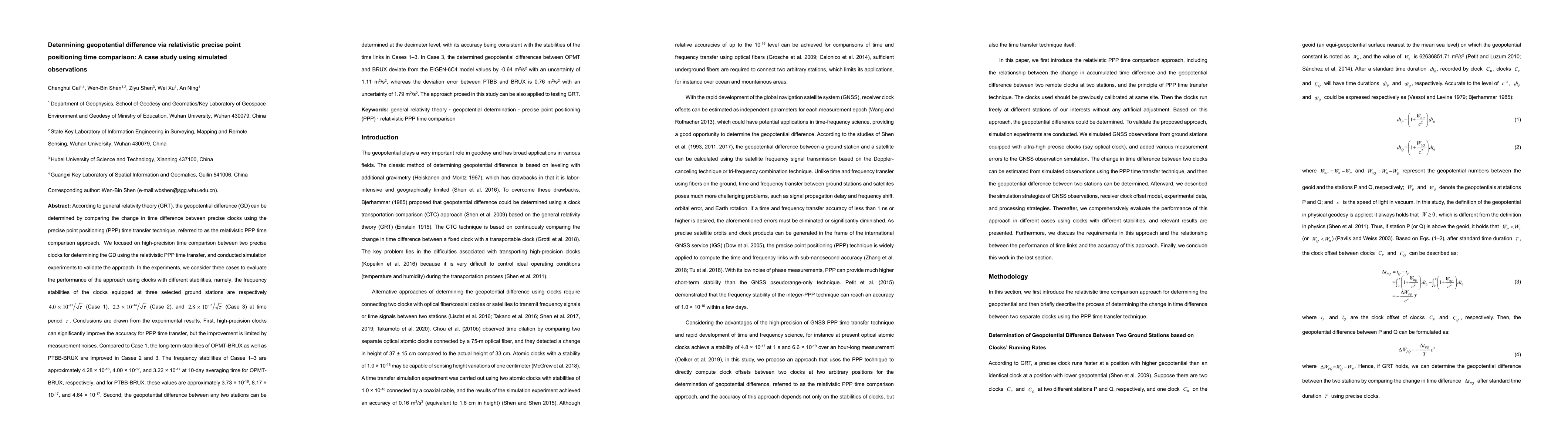 Researchers used simulated observations to validate a method for determining geopotential differences via precise point positioning time comparison, achieving accuracy of up to decimeter level and testing the validity of general relativity theory.