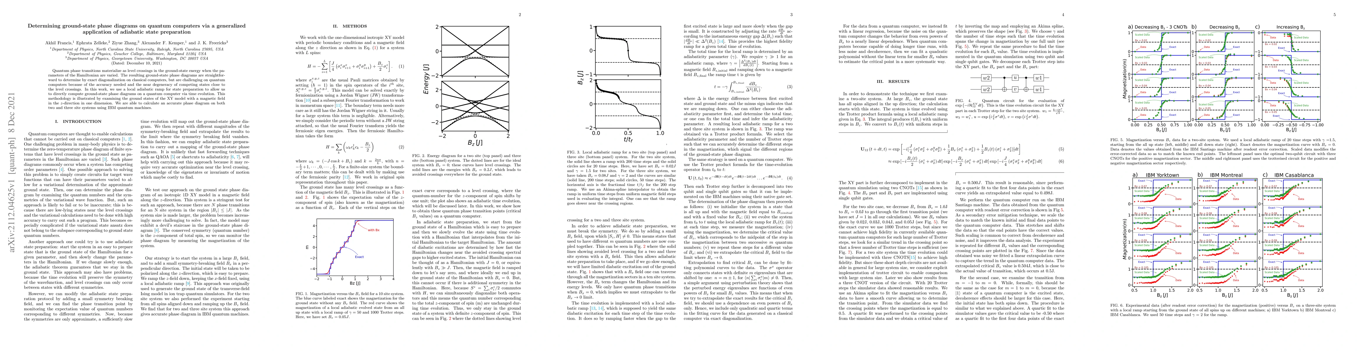 This paper proposes a method for determining ground-state phase diagrams on quantum computers using adiabatic state preparation. The authors demonstrate this technique by computing the phase diagram of the XY model with a magnetic field on IBM quantum machines, achieving accurate results for both two and three site systems.