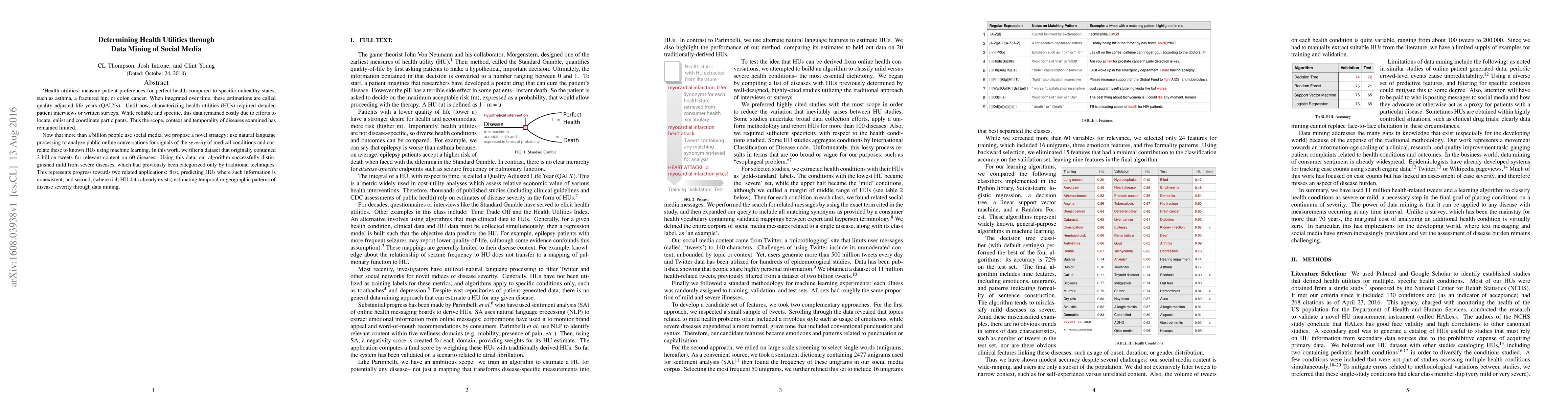 'Health utilities' measure patient preferences for perfect health compared to specific unhealthy states, such as asthma, a fractured hip, or colon cancer. When integrated over time, these estimations are called quality adjusted life years (QALYs). Until now, characterizing health utilities (HUs) required detailed patient interviews or written surveys. While reliable and specific, this data remained costly due to efforts to locate, enlist and coordinate participants. Thus the scope, context and temporality of diseases examined has remained limited. Now that more than a billion people use social media, we propose a novel strategy: use natural language processing to analyze public online conversations for signals of the severity of medical conditions and correlate these to known HUs using machine learning. In this work, we filter a dataset that originally contained 2 billion tweets for relevant content on 60 diseases. Using this data, our algorithm successfully distinguished mild from severe diseases, which had previously been categorized only by traditional techniques. This represents progress towards two related applications: first, predicting HUs where such information is nonexistent; and second, (where rich HU data already exists) estimating temporal or geographic patterns of disease severity through data mining.