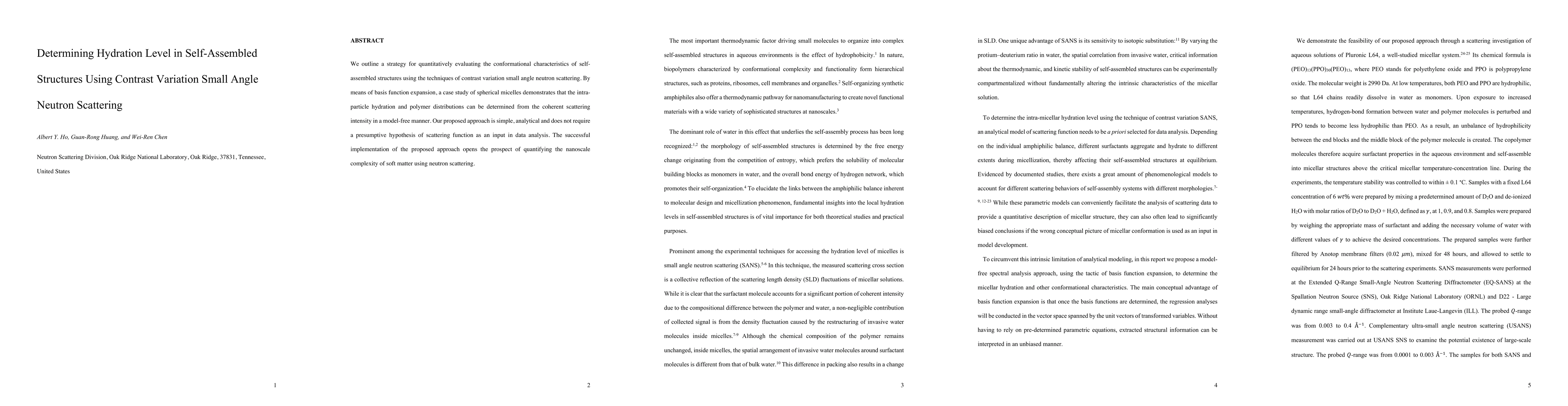 This paper proposes a method using contrast variation small angle neutron scattering to evaluate hydration levels in self-assembled structures without prior assumptions. The technique, demonstrated through spherical micelles, allows for model-free determination of intra-particle hydration and polymer distributions from coherent scattering intensity.