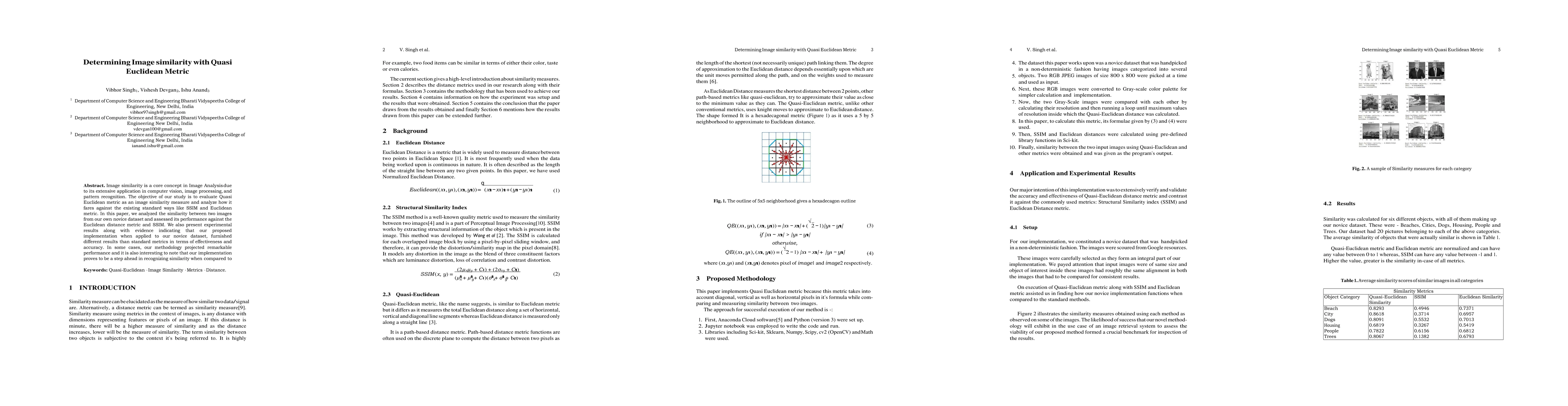 Title: Determining Image similarity with Quasi-Euclidean Metric Summary: This study evaluates the Quasi-Euclidean metric for image similarity, comparing its effectiveness against standard metrics like SSIM and Euclidean distance. Experimental results from a novice dataset indicate that the proposed method can outperform existing metrics in certain scenarios, demonstrating notable accuracy and effectiveness.