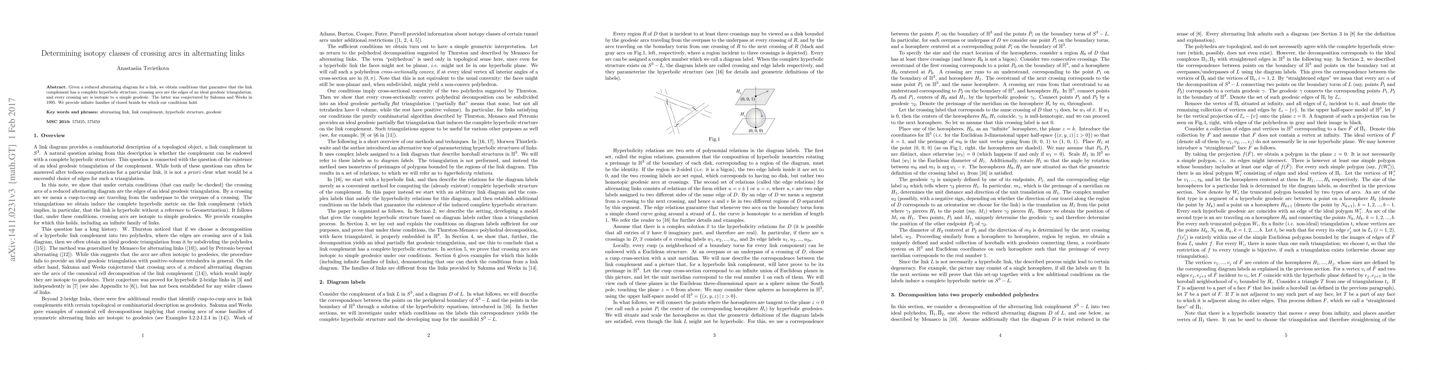 Given a reduced alternating diagram for a link, we obtain conditions that guarantee that the link complement has a complete hyperbolic structure, crossing arcs are the edges of an ideal geodesic triangulation, and every crossing arc is isotopic to a simple geodesic. The latter was conjectured by Sakuma and Weeks in 1995. We provide infinite families of closed braids for which our conditions hold.