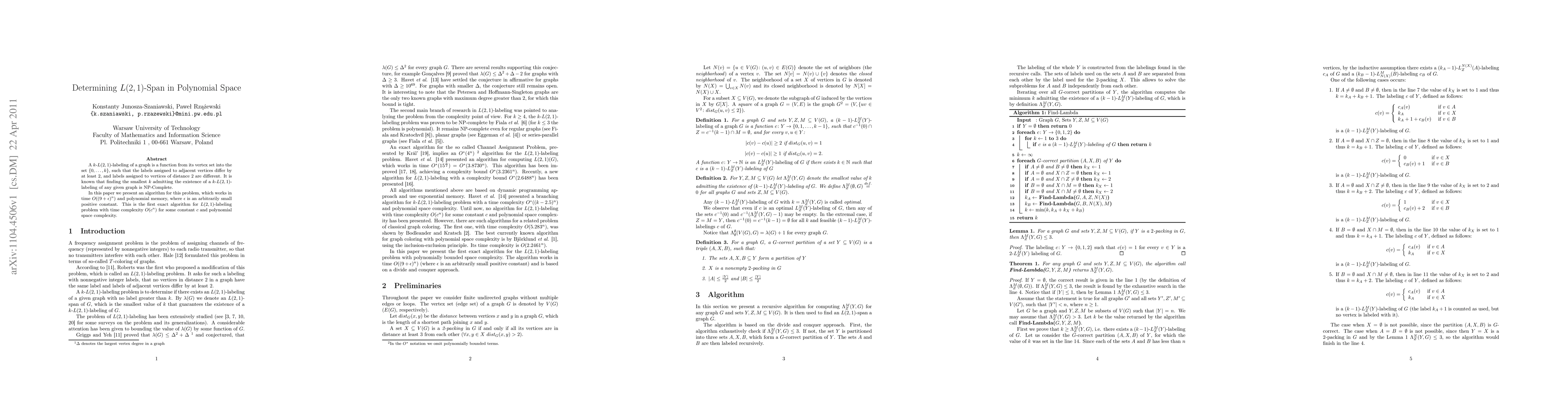 This paper presents an exact algorithm for the NP-Complete L(2,1)-labeling problem, achieving time complexity $O(c^n)$ for some constant $c$ and polynomial space complexity. The algorithm operates in $O(\complexity ^n)$ time with polynomial memory.