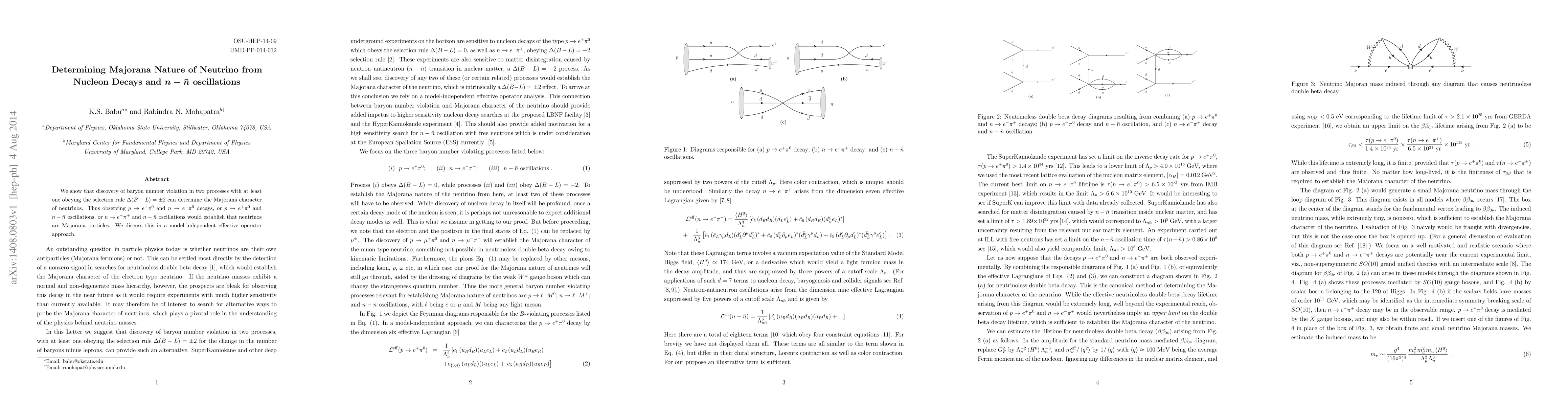 This paper proposes that observing baryon number violation in nucleon decays or neutron-antineutron oscillations, particularly in processes obeying the selection rule Δ(B-L) = ±2, can determine the Majorana nature of neutrinos. It concludes that specific combinations of these decay processes or oscillations would confirm neutrinos as Majorana particles.
