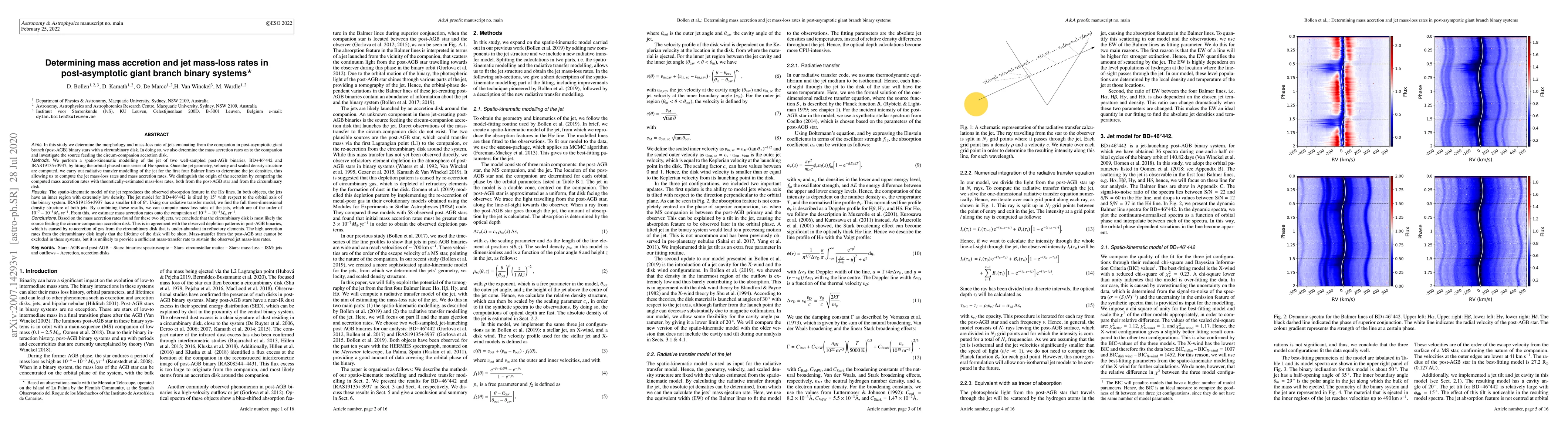Aims. In this study, we determine the morphology and mass-loss rate of jets emanating from the companion in post-asymptotic giant branch (post-AGB) binary stars with a circumbinary disk. In doing so, we also determine the mass accretion rates on to the companion and investigate the source feeding the circum-companion accretion disk. Methods. We perform a spatio-kinematic modelling of the jet of two well-sampled post-AGB binaries, BD+46442 and IRAS19135+3937, by fitting the orbital phased time series of H-alpha spectra. Once the jet geometry, velocity and scaled density structure are computed, we carry out radiative transfer modelling of the jet for the first four Balmer lines to determine the jet densities, thus allowing us to compute the jet mass-loss rates and mass accretion rates. Results. The spatio-kinematic model of the jet reproduces the observed absorption feature in the H-alpha lines. In both objects, the jets have an inner region with extremely low density. Using our radiative transfer model, we find the full three-dimensional density structure of both jets. From these results, we can compute mass-loss rates of the jets, which are of the order of 10^-7 - 10^-5 M_sol/yr. We estimate mass accretion rates onto the companion of 10^-6 - 10^-4 M_sol/yr. Conclusions. Based on the mass accretion rates found for these two objects, we conclude that the circumbinary disk is most likely the source feeding the circum-companion accretion disk. This is in agreement with the observed depletion patterns in post-AGB binaries. The high accretion rates from the circumbinary disk imply that the lifetime of the disk will be short. Mass-transfer from the post-AGB star cannot be excluded in these systems, but it is unlikely to provide a sufficient mass-transfer rate to sustain the observed jet mass-loss rates.