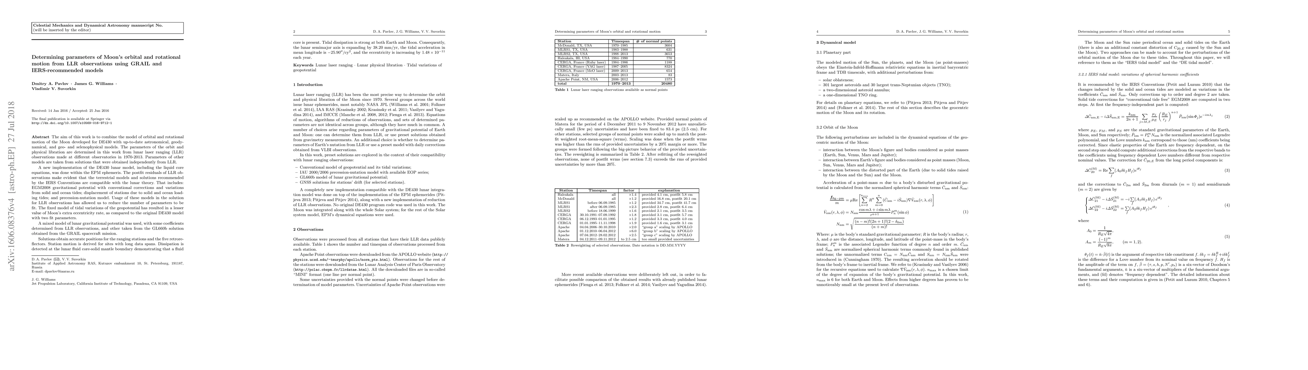 The aim of this work is to combine the model of orbital and rotational motion of the Moon developed for DE430 with up-to-date astronomical, geodynamical, and geo- and selenophysical models. The parameters of the orbit and physical libration are determined in this work from LLR observations made at different observatories in 1970-2013. Parameters of other models are taken from solutions that were obtained independently from LLR. A new implementation of the DE430 lunar model, including the liquid core equations, was done within the EPM ephemeris. The postfit residuals of LLR observations make evident that the terrestrial models and solutions recommended by the IERS Conventions are compatible with the lunar theory. That includes: EGM2008 with conventional corrections and variations from solid and ocean tides; displacement of stations due to solid and ocean loading tides; and precession-nutation model. Usage of these models in the solution for LLR observations has allowed us to reduce the number of parameters to be fit. The fixed model of tidal variations of the geopotential has resulted in a lesser value of Moon's extra eccentricity rate, as compared to the original DE430 model with two fit parameters. A mixed model of lunar gravitational potential was used, with some coefficients determined from LLR observations, and other taken from the GL660b solution. Solutions obtain accurate positions for the ranging stations and the 5 retroreflectors. Station motion is derived for sites with long data spans. Dissipation is detected at the lunar fluid core-solid mantle boundary demonstrating that a fluid core is present. Tidal dissipation is strong at both Earth and Moon. Consequently, the lunar semimajor axis is expanding by 38.20 mm/yr, the tidal acceleration in mean longitude is -25.90 "/cy2, and the eccentricity is increasing by 1.48e-11 each year.