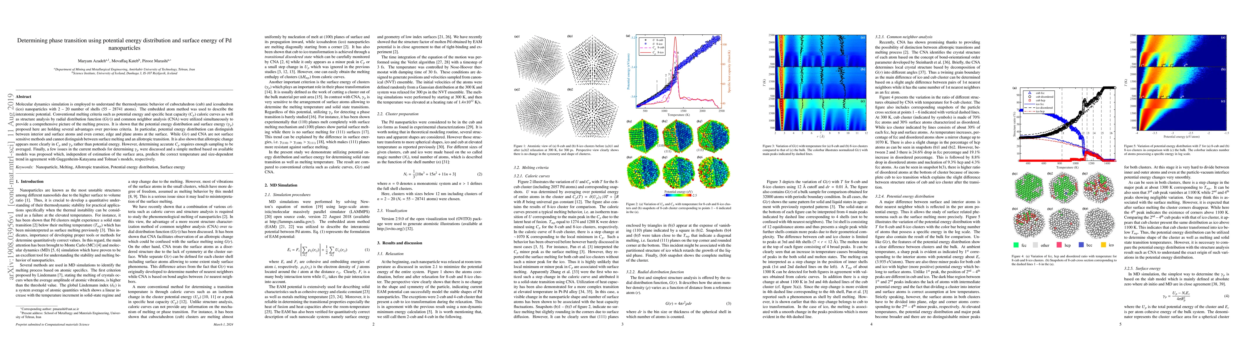 Molecular dynamics simulation is employed to understand the thermodynamic behavior of cuboctahedron (cub) and icosahedron (ico) nanoparticles with 2-20 number of shells (55-28741 atoms). The embedded atom method was used to describe the interatomic potential. Conventional melting criteria such as potential energy and specific heat capacity (C_p) caloric curves as well as structure analysis by radial distribution function (G(r)) and common neighbor analysis (CNA) were utilized simultaneously to provide a comprehensive picture of the melting process. It is shown that the potential energy distribution and surface energy (gamma_p) proposed here are holding several advantages over previous criteria. In particular, potential energy distribution can distinguish between interior and surface atoms and even corner, edge and plane atoms at the surface. While G(r) and CNA are not surface sensitive methods and cannot distinguish between surface melting and an allotropic transition. It is also shown that allotropic change appears more clearly in C_p and gamma_p rather than potential energy. However, determining accurate C_p requires enough sampling to be averaged. Finally, a few issues in the current methods for determining gamma_p were discussed and a simple method based on available models was proposed which, independent of estimation of the surface area, predicts the correct temperature and size-dependent trend in agreement with Guggenheim-Katayama and Tolman's models, respectively.