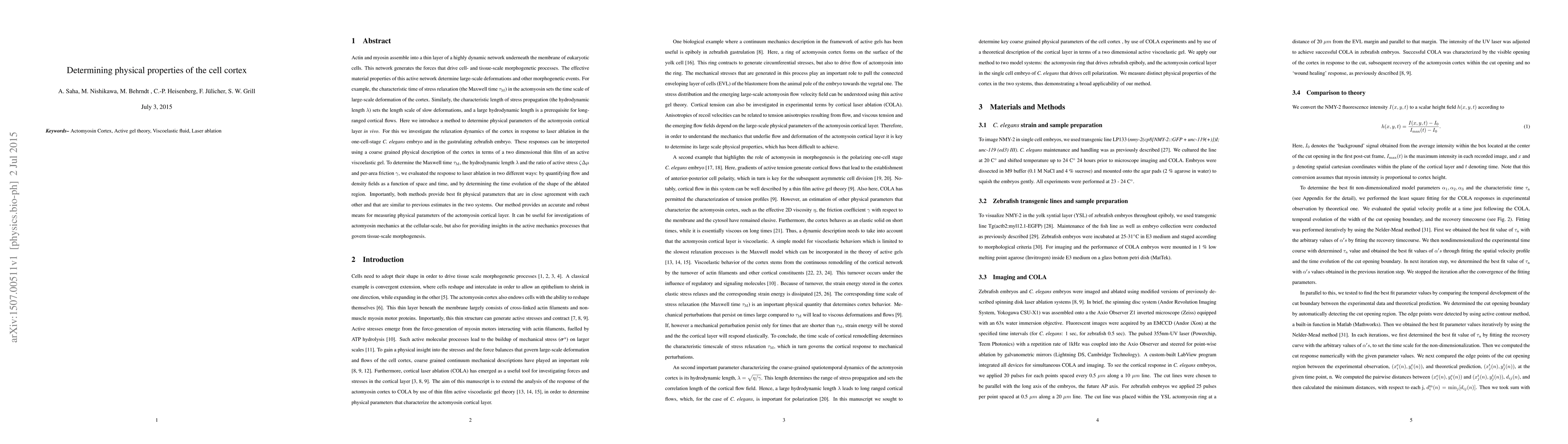 This paper introduces a method to determine physical properties of the actomyosin cortical layer in living cells using laser ablation and analysis of relaxation dynamics in {\it C. elegans} and zebrafish embryos. The study provides a robust means for measuring parameters like Maxwell time and hydrodynamic length, offering insights into cellular-scale mechanics and tissue-scale morphogenesis.