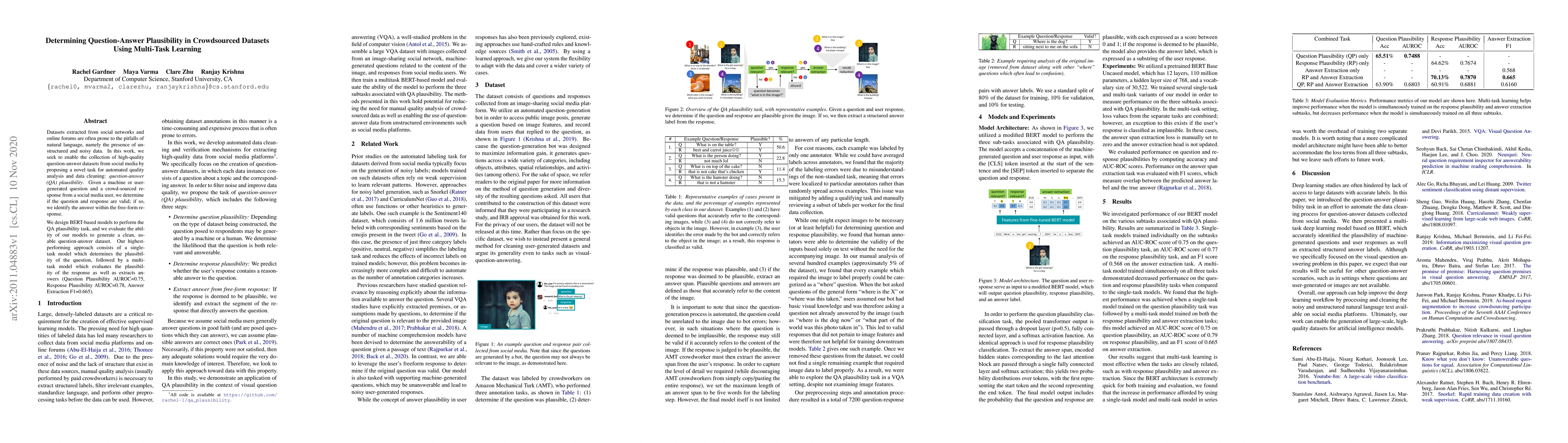 Datasets extracted from social networks and online forums are often prone to the pitfalls of natural language, namely the presence of unstructured and noisy data. In this work, we seek to enable the collection of high-quality question-answer datasets from social media by proposing a novel task for automated quality analysis and data cleaning: question-answer (QA) plausibility. Given a machine or user-generated question and a crowd-sourced response from a social media user, we determine if the question and response are valid; if so, we identify the answer within the free-form response. We design BERT-based models to perform the QA plausibility task, and we evaluate the ability of our models to generate a clean, usable question-answer dataset. Our highest-performing approach consists of a single-task model which determines the plausibility of the question, followed by a multi-task model which evaluates the plausibility of the response as well as extracts answers (Question Plausibility AUROC=0.75, Response Plausibility AUROC=0.78, Answer Extraction F1=0.665).