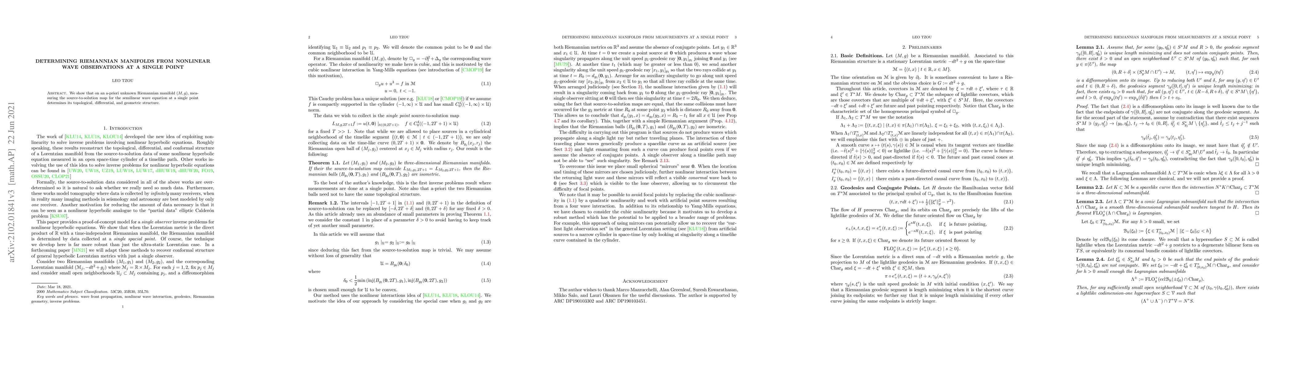 We show that on an a-priori unknown Riemannian manifold $(M,g)$, measuring the source-to-solution map for the semilinear wave equation at a single point determines the topological, differential, and geometric structure.