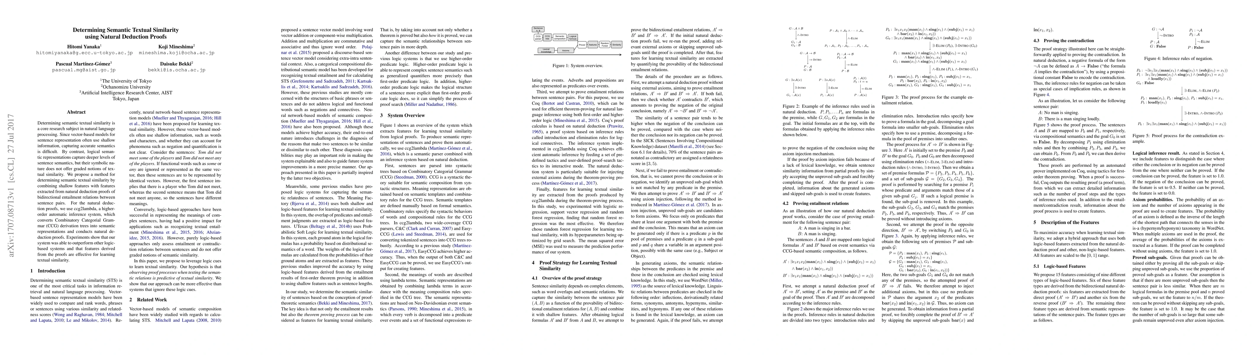 The paper proposes a method for determining semantic textual similarity by combining shallow features with features extracted from natural deduction proofs of bidirectional entailment relations between sentence pairs, using ccg2lambda for automatic inference.