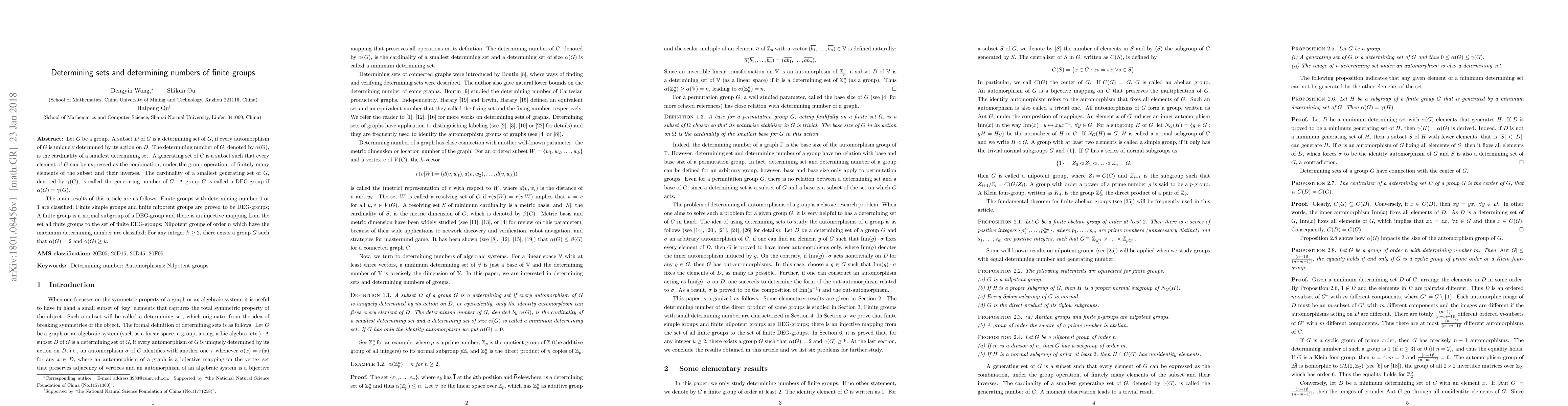 Let $G$ be a group. A subset $D$ of $G$ is a determining set of $G$, if every automorphism of $G$ is uniquely determined by its action on $D$. The determining number of $G$, denoted by $\alpha(G)$, is the cardinality of a smallest determining set. A generating set of $G$ is a subset such that every element of $G$ can be expressed as the combination, under the group operation, of finitely many elements of the subset and their inverses. The cardinality of a smallest generating set of $G$, denoted by $\gamma(G)$, is called the generating number of $G$. A group $G$ is called a DEG-group if $\alpha(G)=\gamma(G)$. The main results of this article are as follows. Finite groups with determining number $0$ or $1$ are classified; Finite simple groups and finite nilpotent groups are proved to be DEG-groups; A finite group is a normal subgroup of a DEG-group and there is an injective mapping from the set all finite groups to the set of finite DEG-groups; Nilpotent groups of order $n$ which have the maximum determining number are classified; For any integer $k\geq 2$, there exists a group $G$ such that $\alpha(G)=2$ and $\gamma(G)\geq k$.