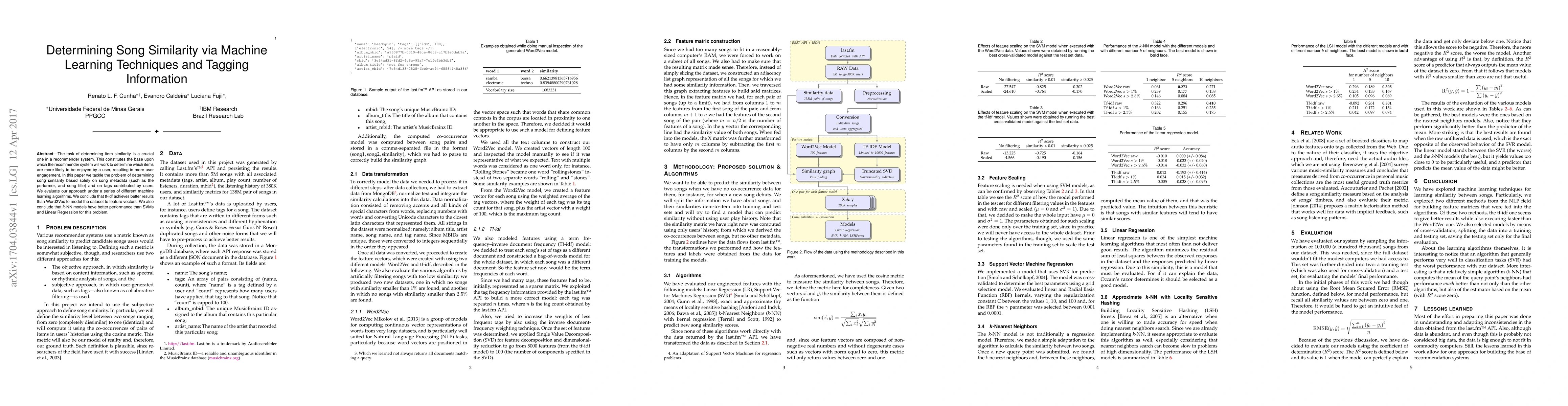 The task of determining item similarity is a crucial one in a recommender system. This constitutes the base upon which the recommender system will work to determine which items are more likely to be enjoyed by a user, resulting in more user engagement. In this paper we tackle the problem of determining song similarity based solely on song metadata (such as the performer, and song title) and on tags contributed by users. We evaluate our approach under a series of different machine learning algorithms. We conclude that tf-idf achieves better results than Word2Vec to model the dataset to feature vectors. We also conclude that k-NN models have better performance than SVMs and Linear Regression for this problem.