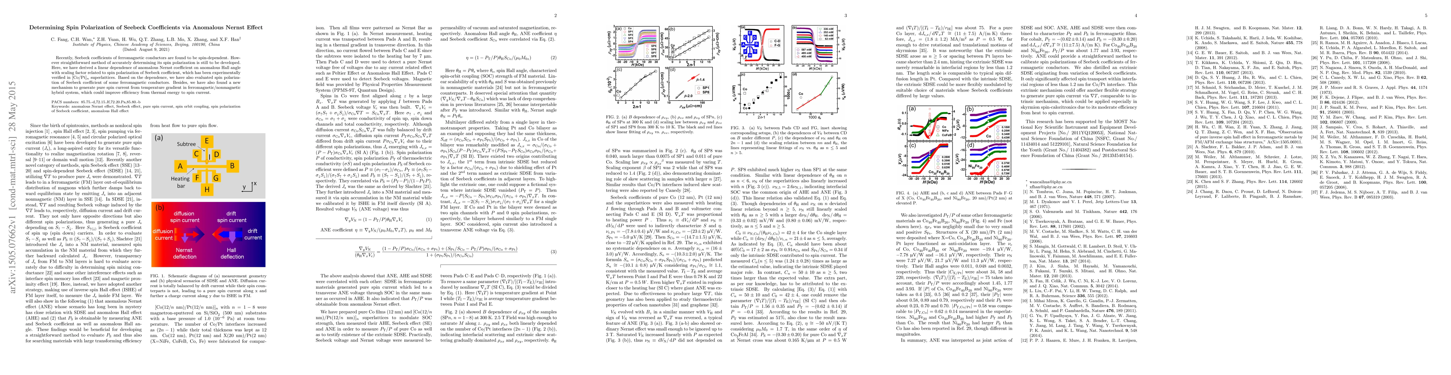 Recently, Seebeck coefficients of ferromagnetic conductors are found to be spin-dependent. However straightforward method of accurately determining its spin polarization is still to be developed. Here, we have derived a linear dependence of anomalous Nernst coefficient on anomalous Hall angle with scaling factor related to spin polarization of Seebeck coefficient, which has been experimentally verified in [Co/Pt]n superlattices. Based on the dependence, we have also evaluated spin polarization of Seebeck coefficient of some ferromagnetic conductors. Besides, we have also found a new mechanism to generate pure spin current from temperature gradient in ferromagnetic/nonmagnetic hybrid system, which could improve efficiency from thermal energy to spin current.