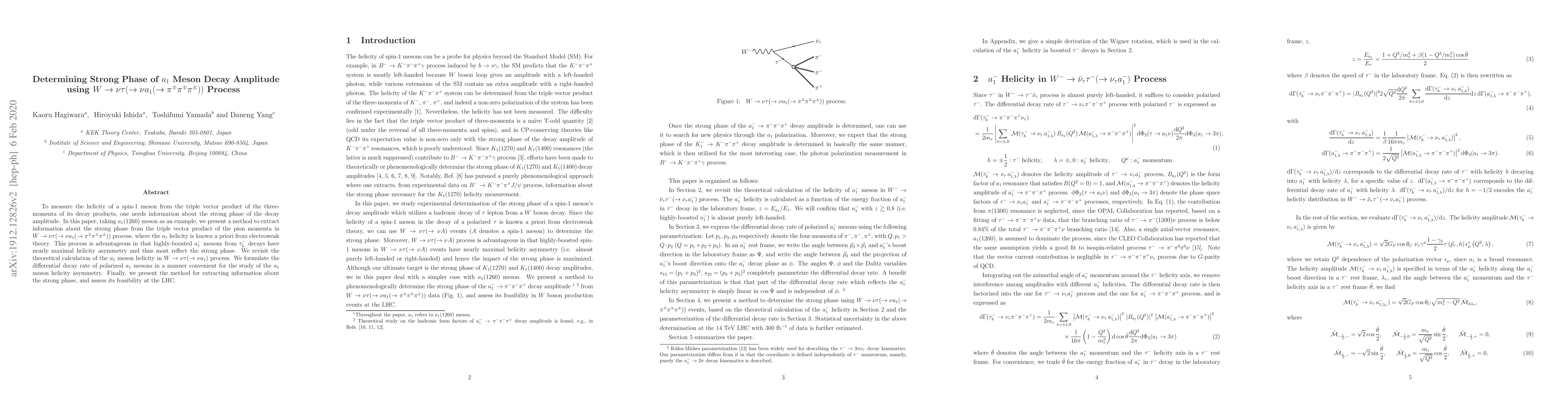 To measure the helicity of a spin-1 meson from the triple vector product of the three-momenta of its decay products, one needs information about the strong phase of the decay amplitude. In this paper, taking $a_1(1260)$ meson as an example, we present a method to extract information about the strong phase from the triple vector product of the pion momenta in $W \to \nu \tau(\to \nu a_1(\to\pi^\mp \pi^\mp \pi^\pm))$ process, where the $a_1$ helicity is known a priori from electroweak theory. This process is advantageous in that highly-boosted $a_1^-$ mesons from $\tau_L^-$ decays have nearly maximal helicity asymmetry and thus most reflect the strong phase. We revisit the theoretical calculation of the $a_1$ meson helicity in $W \to \nu \tau(\to \nu a_1)$ process. We formulate the differential decay rate of polarized $a_1$ mesons in a manner convenient for the study of the $a_1$ meson helicity asymmetry. Finally, we present the method for extracting information about the strong phase, and assess its feasibility at the LHC.