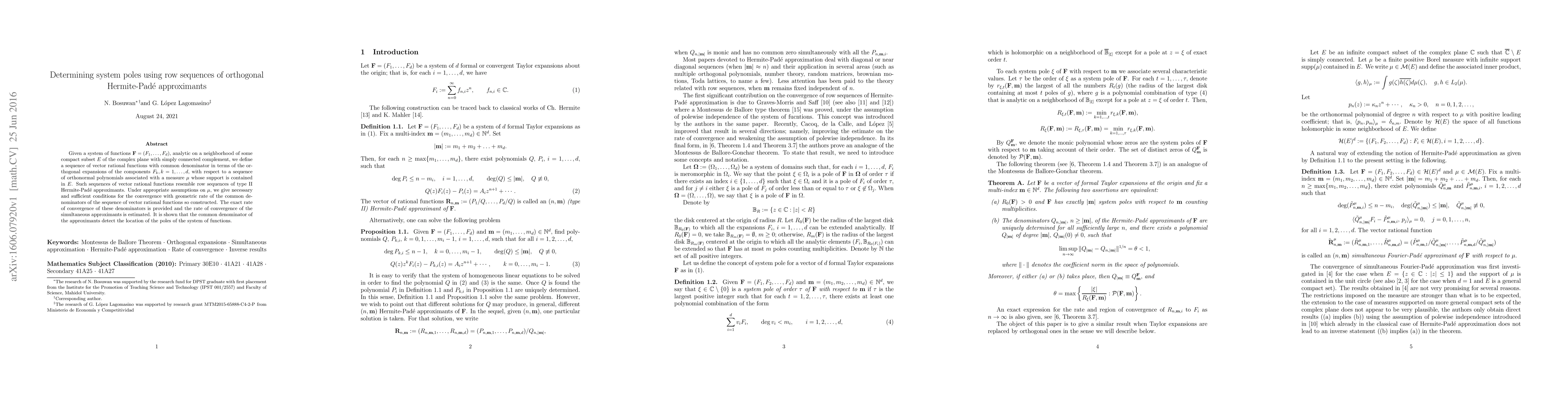 This paper investigates the determination of system poles through the row sequences of orthogonal Hermite-Padé approximants, establishing conditions for the convergence of these approximants and demonstrating that their common denominators reveal the poles' locations.