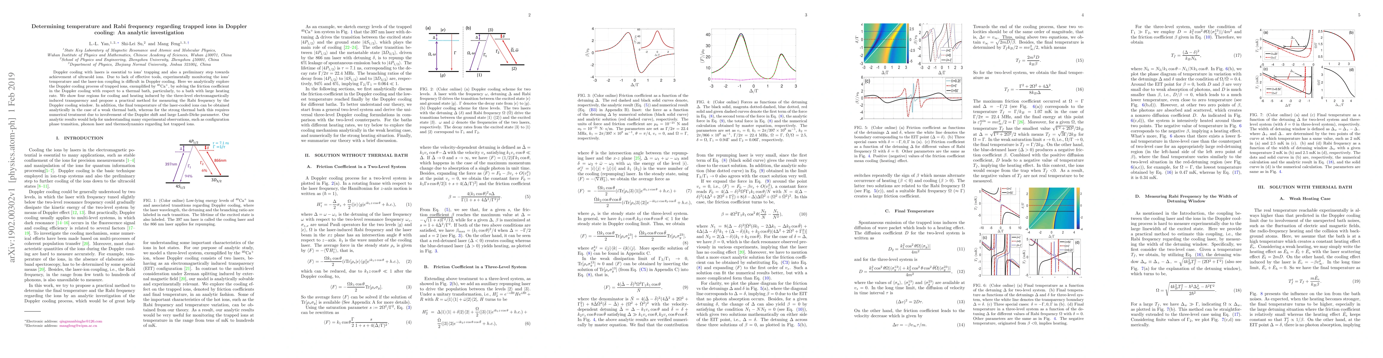 This paper analytically investigates Doppler cooling of trapped ions, specifically $^{40}$Ca$^{+}$, to determine the temperature and Rabi frequency. The study identifies four regions for cooling and heating effects and proposes a method for measuring the Rabi frequency via the Doppler cooling window.