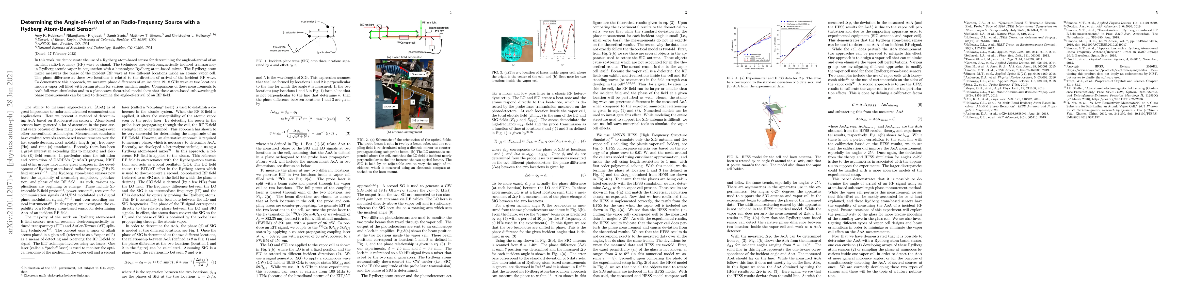 A Rydberg atom-based sensor was developed to measure the angle of arrival (AOA) of an incident radio frequency (RF) signal.