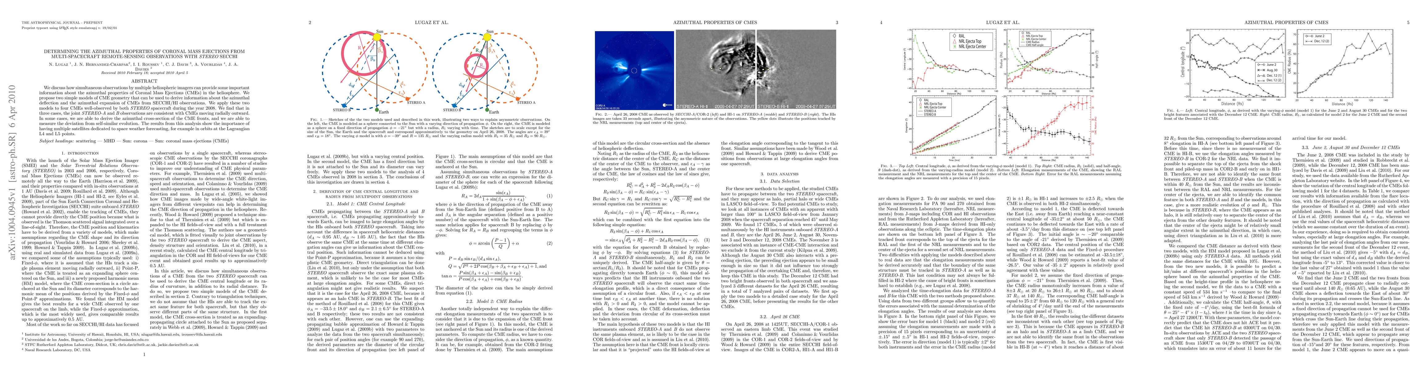 This paper proposes models to determine the azimuthal properties of Coronal Mass Ejections (CMEs) using multi-spacecraft observations from the STEREO mission. The analysis of four CMEs in 2008 reveals radial movement in three cases and highlights the value of multiple satellite observations for space weather forecasting.