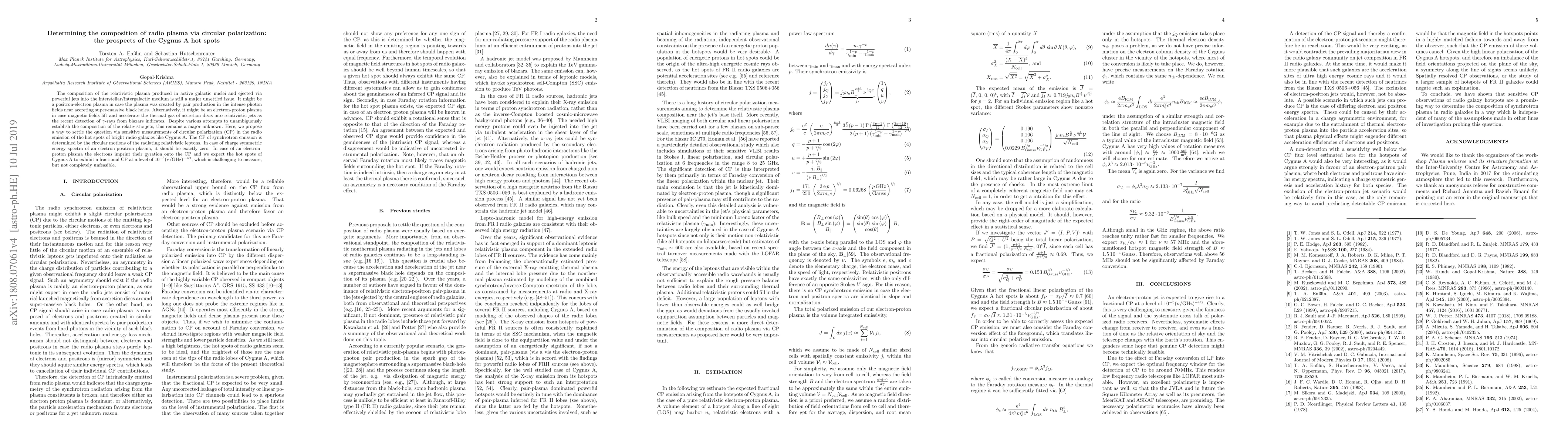 This paper proposes using circular polarization (CP) measurements in Cygnus A's radio hot spots to determine if the plasma is electron-positron or electron-proton. In an electron-positron plasma, CP should be zero, while an electron-proton plasma would show a measurable CP, around $10^{-3},( u/mbox{GHz})^{-{1}/{2}}$.