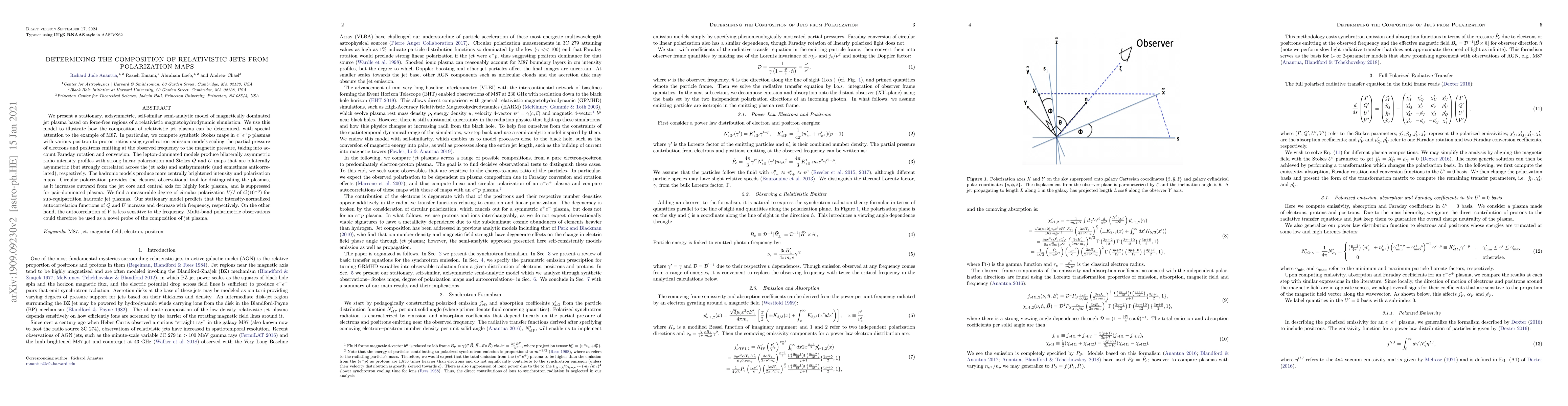 We present a stationary, axisymmetric, self-similar semi-analytic model of magnetically dominated jet plasma based on force-free regions of a relativistic magnetohydrodynamic simulation. We use this model to illustrate how the composition of relativistic jet plasma can be determined, with special attention to the example of M87. In particular, we compute synthetic Stokes maps in e-e+p plasmas with various positron-to-proton ratios using synchrotron emission models scaling the partial pressure of electrons and positrons emitting at the observed frequency to the magnetic pressure, taking into account Faraday rotation and conversion. The lepton-dominated models produce bilaterally asymmetric radio intensity profiles with strong linear polarization and Stokes Q and U maps that are bilaterally asymmetric (but strongly up-down correlated) and antisymmetric (and sometimes up-down anticorrelated), respectively. The hadronic models produce more centrally brightened intensity and polarization maps. Circular polarization provides the cleanest observational tool for distinguishing the plasmas, as it increases outward from the jet core and central axis for highly ionic plasma, and is suppressed for pair dominated plasma. We find a measurable degree of circular polarization V/I of O(10e-3) for sub-equipartition hadronic jet plasmas. Our stationary model predicts that the intensity-normalized autocorrelation functions of Q and U increase and decrease with frequency, respectively. On the other hand, the autocorrelation of V is less sensitive to the frequency. Multi-band polarimetric observations could therefore be used as a novel probe of the composition of jet plasma.