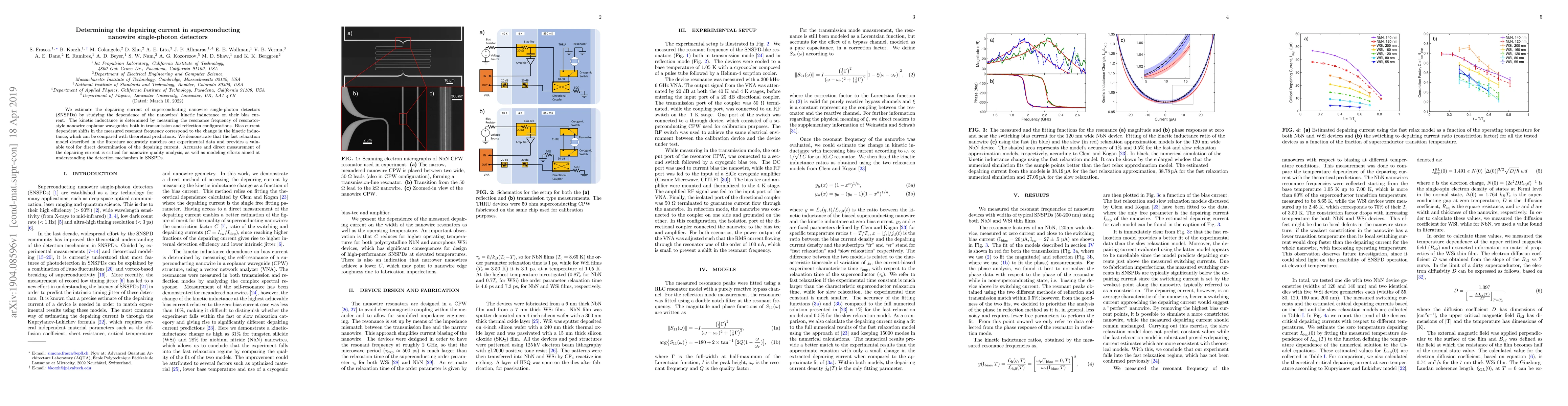 This paper estimates the depairing current in superconducting nanowire single photon detectors (SNSPDs) by analyzing the bias current-dependent shifts in the resonance frequency of nanowire coplanar waveguides. The study confirms that the fast relaxation model aligns well with experimental data, providing a reliable method for determining the depairing current, which is essential for assessing nanowire quality and understanding SNSPD detection mechanisms.