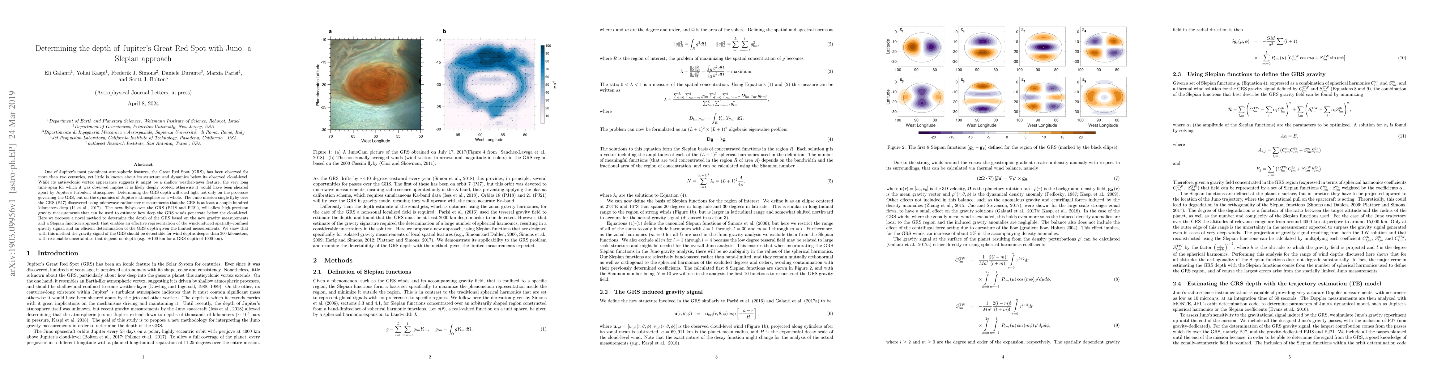 This paper proposes a novel method using Slepian functions to determine the depth of Jupiter's Great Red Spot (GRS) based on upcoming high-precision gravity measurements from the Juno mission. The method aims to effectively represent the wind-induced gravity signal and estimate the GRS depth, suggesting it can detect GRS wind depths deeper than 300 kilometers with reasonable uncertainties.