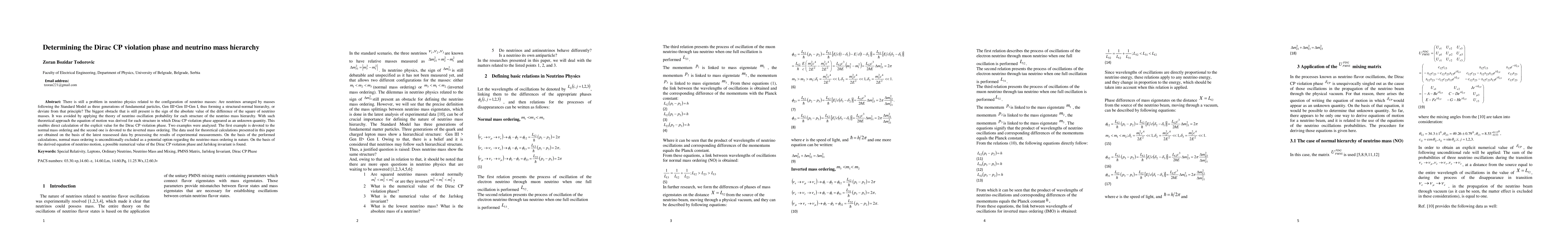There is still a problem in neutrino physics related to the configuration of neutrino masses: Are neutrinos arranged by masses following the Standard Model as three generations of fundamental particles, Gen III>Gen II>Gen I, thus forming a structural-normal hierarchy, or deviate from that principle? The biggest obstacle that is still present is the sign of the absolute value of the difference of the square of neutrino masses. It was avoided by applying the theory of neutrino oscillation probability for each structure of the neutrino mass hierarchy. With such a theoretical approach the equation of motion was derived for each structure in which the Dirac CP violation phase appeared as an unknown quantity. This enables direct calculation of the explicit value for the Dirac CP violation phase. Two examples were analyzed: The first example is devoted to the normal mass ordering and the second one is devoted to the inverted mass ordering. The data used for theoretical calculations presented in this paper are obtained on the basis of the latest reassessed data by processing the results of experimental measurements. On the basis of the performed calculations, normal mass ordering is unconditionally excluded as a potential option regarding the neutrino mass ordering in nature. On the basis of the derived equation of neutrino motion, a possible numerical value of the Dirac CP violation phase and Jarlskog invariant is found.