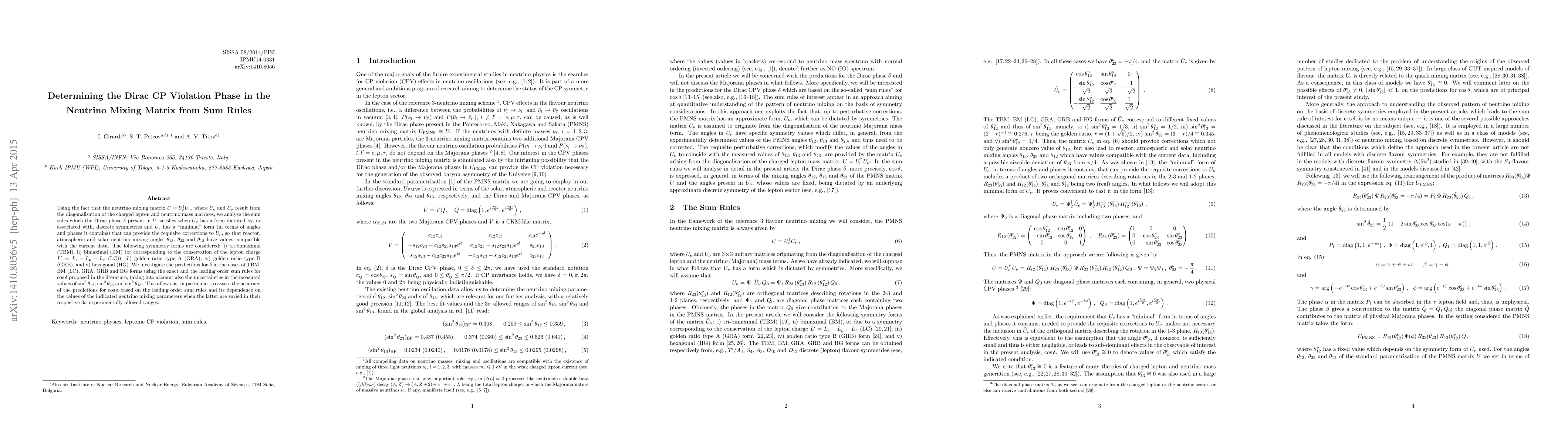 Researchers used sum rules to analyze the Dirac CP violation phase in neutrino mixing matrices for various flavor symmetry forms, aiming to find compatible values with current data on neutrino mixing angles.