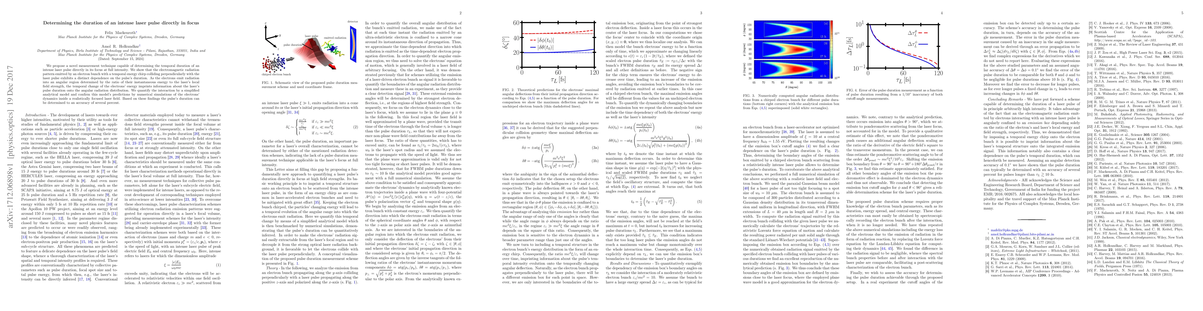 We propose a novel measurement technique capable of determining the temporal duration of an intense laser pulse directly in its focus at full intensity. We show that the electromagnetic radiation pattern emitted by an electron bunch with a temporal energy chirp colliding perpendicularly with the laser pulse exhibits a distinct dependence on the pulse's duration. As the electrons emit radiation into an angular region determined by the ratio of their instantaneous energy to the laser's local field strength, the temporal change of the electrons' energy imprints information about the laser's pulse duration onto the angular radiation distribution. We quantify the interaction by a simplified analytical model and confirm this model's predictions by numerical simulations of the electrons' dynamics inside a realistically focused laser field. Based on these findings the pulse's duration can be determined to an accuracy of several percent.