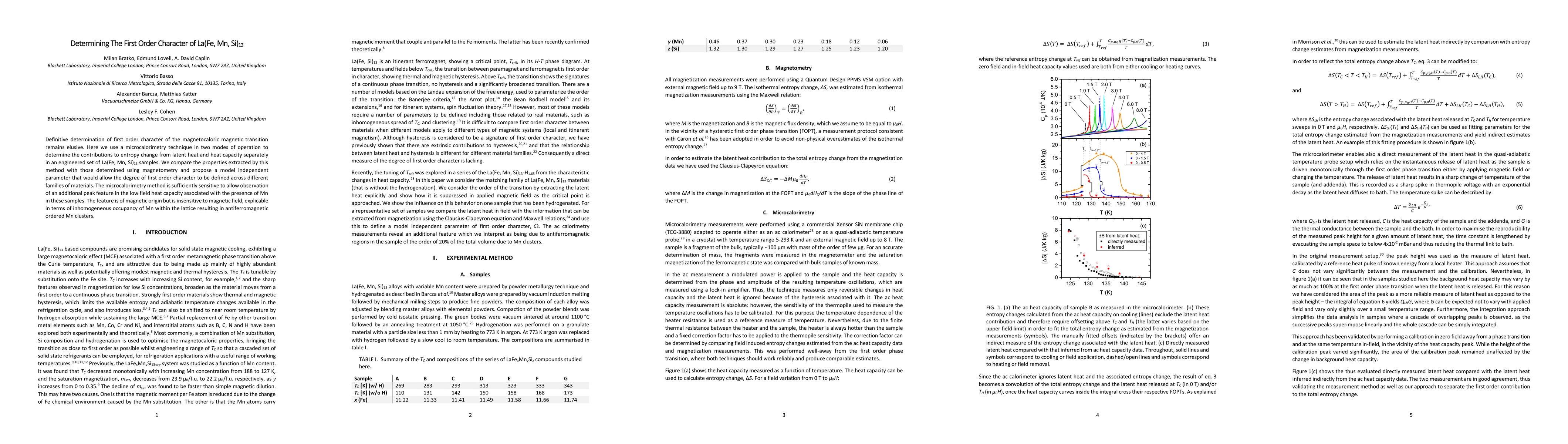 Definitive determination of first order character of the magnetocaloric magnetic transition remains elusive. Here we use a microcalorimetry technique in two modes of operation to determine the contributions to entropy change from latent heat and heat capacity separately in an engineered set of La(Fe, Mn, Si)13 samples. We compare the properties extracted by this method with those determined using magnetometry and propose a model independent parameter that would allow the degree of first order character to be defined across different families of materials. The microcalorimetry method is sufficiently sensitive to allow observation of an additional peak feature in the low field heat capacity associated with the presence of Mn in these samples. The feature is of magnetic origin but is insensitive to magnetic field, explicable in terms of inhomogeneous occupancy of Mn within the lattice resulting in antiferromagnetic ordered Mn clusters.