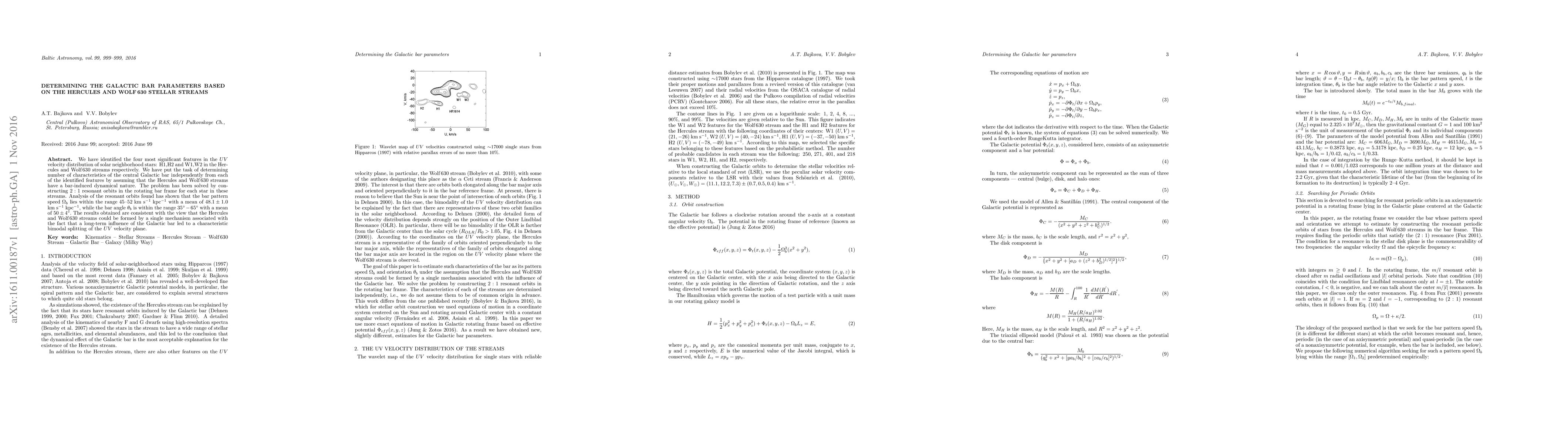 The study determined Galactic bar parameters by analyzing the Hercules and Wolf 630 stellar streams. It used a model of the Galactic potential, including axisymmetric and bar components, to construct stellar orbits and find resonant periodic orbits in the bar's rotating frame.