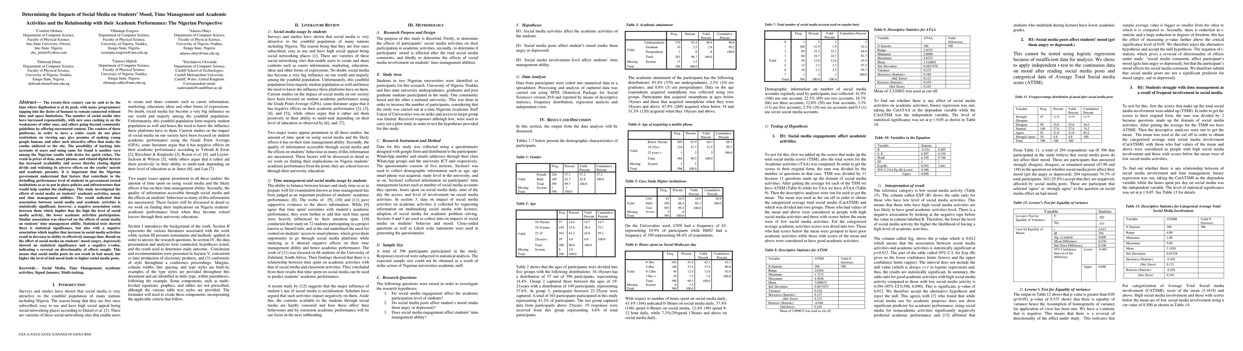 This study examines the impact of social media on Nigerian students' mood, time management, and academic performance, finding a significant negative association between social media use and both academic activities and time management. The results suggest that increased social media engagement correlates with poorer academic outcomes.