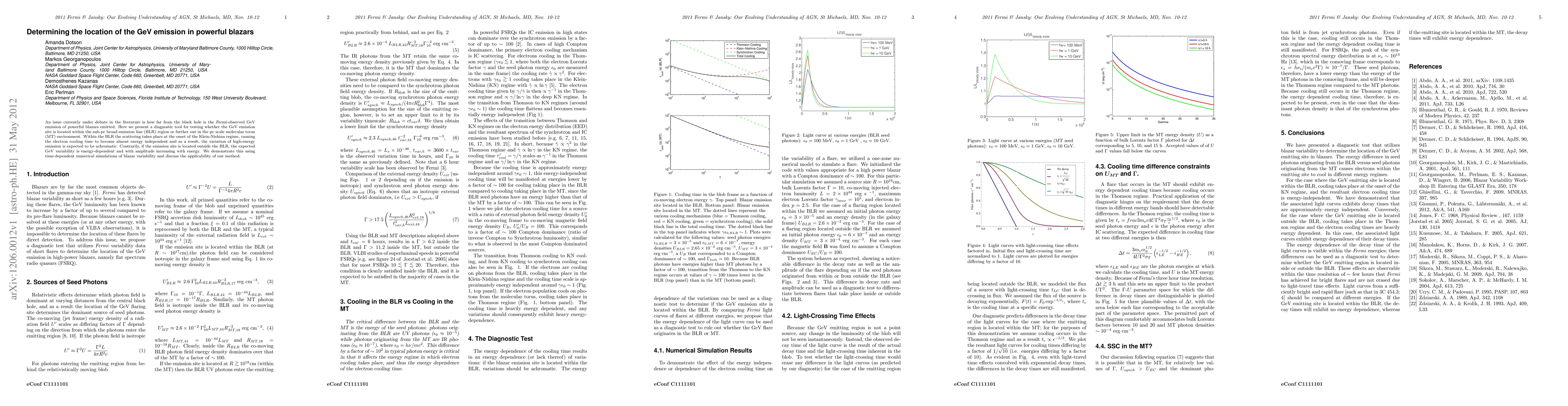 This research proposes a diagnostic tool to determine if the GeV emission in powerful blazars originates within the sub-pc broad emission line region near the black hole or further out in the pc scale molecular torus. The methodology involves analyzing the achromatic vs. energy-dependent variability characteristics of the emission, supported by time-dependent numerical simulations. The tool aims to resolve the ongoing debate in the literature about the GeV emission site location.