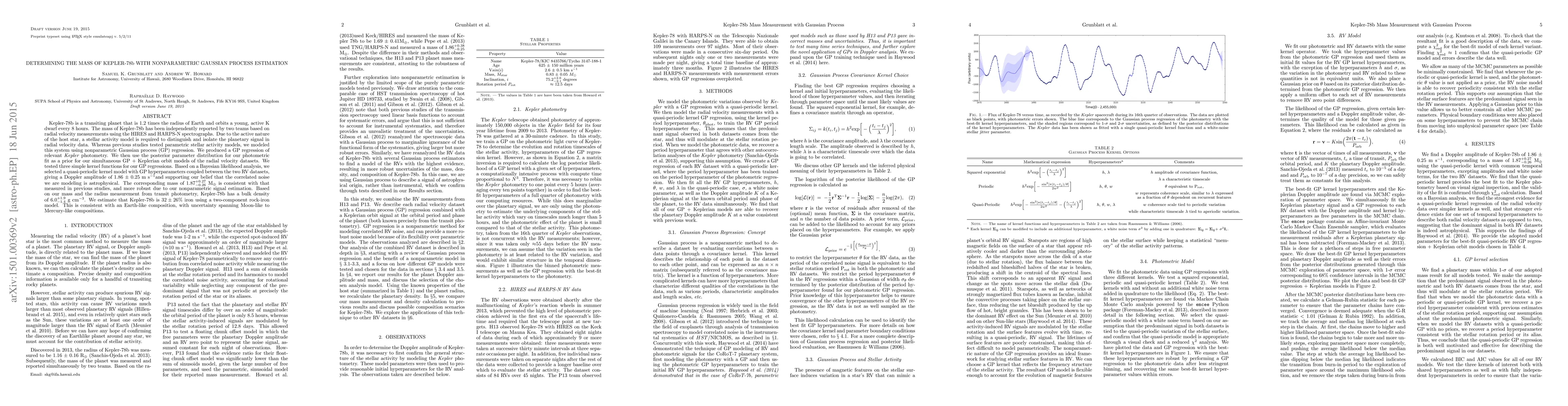 Kepler-78b is a transiting planet that is 1.2 times the radius of Earth and orbits a young, active K dwarf every 8 hours. The mass of Kepler-78b has been independently reported by two teams based on radial velocity measurements using the HIRES and HARPS-N spectrographs. Due to the active nature of the host star, a stellar activity model is required to distinguish and isolate the planetary signal in radial velocity data. Whereas previous studies tested parametric stellar activity models, we modeled this system using nonparametric Gaussian process (GP) regression. We produced a GP regression of relevant Kepler photometry. We then use the posterior parameter distribution for our photometric fit as a prior for our simultaneous GP + Keplerian orbit models of the radial velocity datasets. We tested three simple kernel functions for our GP regressions. Based on a Bayesian likelihood analysis, we selected a quasi-periodic kernel model with GP hyperparameters coupled between the two RV datasets, giving a Doppler amplitude of 1.86 $\pm$ 0.25 m s$^{-1}$ and supporting our belief that the correlated noise we are modeling is astrophysical. The corresponding mass of 1.87 $^{+0.27}_{-0.26}$ M$_{\oplus}$ is consistent with that measured in previous studies, and more robust due to our nonparametric signal estimation. Based on our mass and the radius measurement from transit photometry, Kepler-78b has a bulk density of 6.0$^{+1.9}_{-1.4}$ g cm$^{-3}$. We estimate that Kepler-78b is 32$\pm$26% iron using a two-component rock-iron model. This is consistent with an Earth-like composition, with uncertainty spanning Moon-like to Mercury-like compositions.