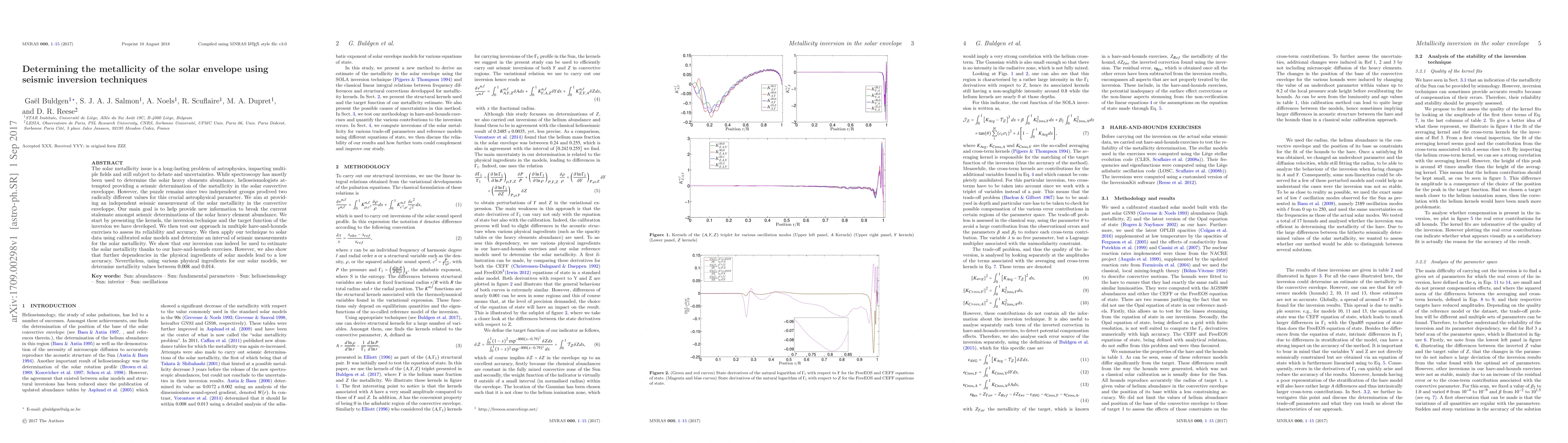 The solar metallicity issue is a long-lasting problem of astrophysics, impacting multi- ple fields and still subject to debate and uncertainties. While spectroscopy has mostly been used to determine the solar heavy elements abundance, helioseismologists at- tempted providing a seismic determination of the metallicity in the solar convective enveloppe. However, the puzzle remains since two independent groups prodived two radically different values for this crucial astrophysical parameter. We aim at provid- ing an independent seismic measurement of the solar metallicity in the convective enveloppe. Our main goal is to help provide new information to break the current stalemate amongst seismic determinations of the solar heavy element abundance. We start by presenting the kernels, the inversion technique and the target function of the inversion we have developed. We then test our approach in multiple hare-and-hounds exercises to assess its reliability and accuracy. We then apply our technique to solar data using calibrated solar models and determine an interval of seismic measurements for the solar metallicity. We show that our inversion can indeed be used to estimate the solar metallicity thanks to our hare-and-hounds exercises. However, we also show that further dependencies in the physical ingredients of solar models lead to a low accuracy. Nevertheless, using various physical ingredients for our solar models, we determine metallicity values between 0.008 and 0.014.