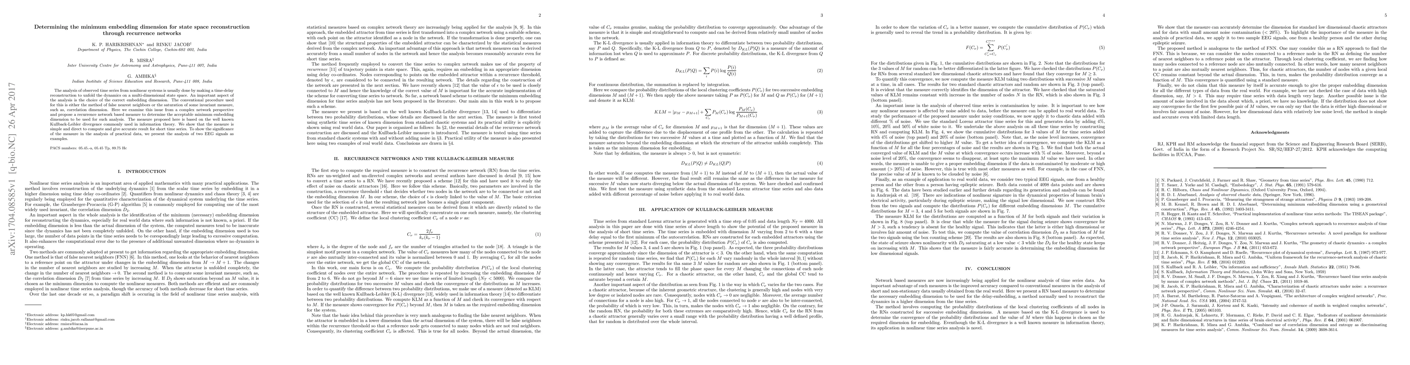 A new method using Kullback-Leibler divergence is proposed to determine the minimum embedding dimension for state space reconstruction in nonlinear systems, providing accurate results for short time series.