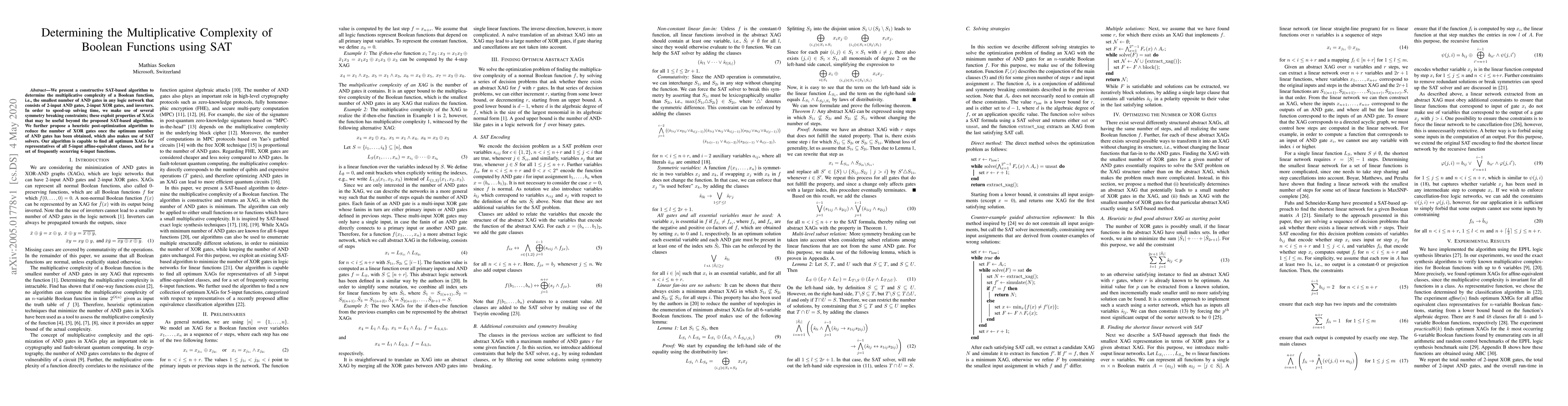 This paper introduces a SAT-based algorithm to determine the multiplicative complexity of Boolean functions, focusing on the minimum number of AND gates in logic networks. It employs symmetry breaking constraints and a heuristic post-optimization algorithm to enhance solving efficiency and reduce XOR gates.
