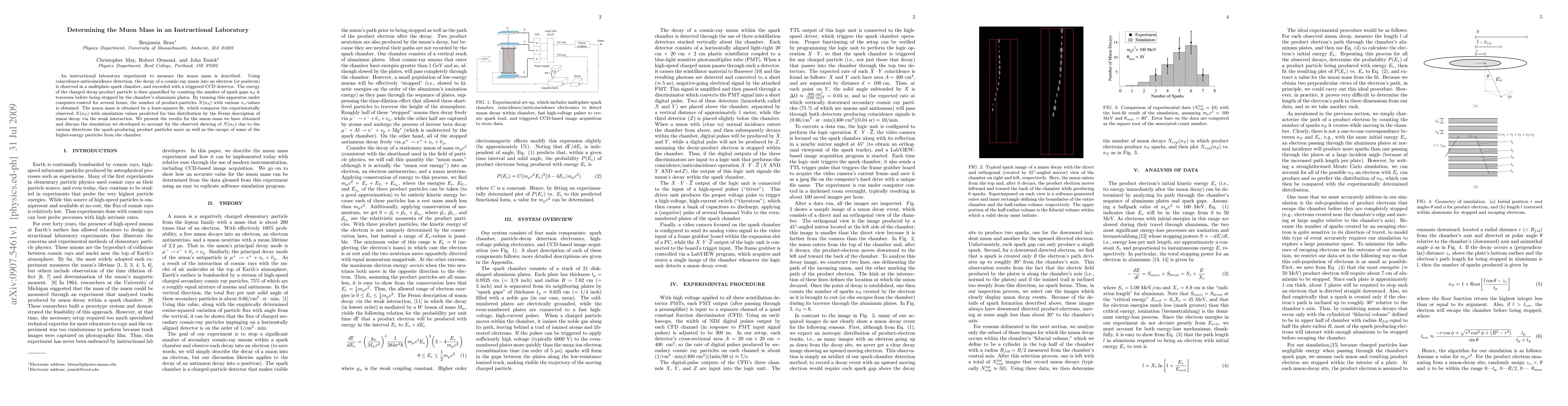 An instructional laboratory experiment to measure the muon mass is described. Using coincidence-anticoincidence detection, the decay of a cosmic-ray muon into an electron (or positron) is observed in a multiplate spark chamber, and recorded with a triggered CCD detector. The energy of the charged decay-product particle is then quantified by counting the number of spark gaps $n_S$ it traverses before being stopped by the chamber's aluminum plates. By running this apparatus under computer-control for several hours, the number of product-particles $N(n_S)$ with various $n_s$-values is obtained. The muon mass is obtained by a least-squares fit, which compares the experimentally observed $N(n_S)$ with simulation values predicted for this distribution by the Fermi description of muon decay via the weak interaction. We present the results for the muon mass we have obtained and discuss the simulation we developed to account for the observed skewing of $N(n_S)$ due to the various directions the spark-producing product particles move as well as the escape of some of the higher-energy particles from the chamber.